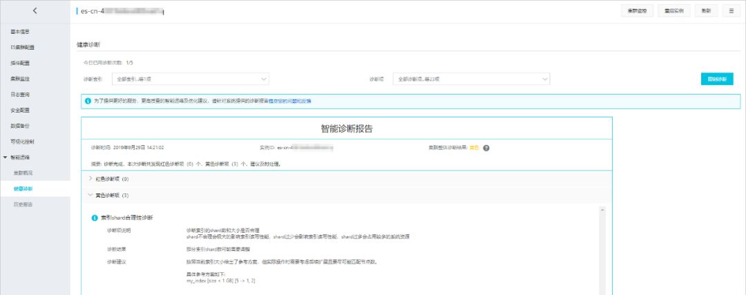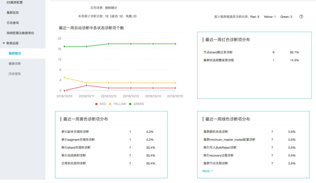 比如当decider触发disk_threshold时,诊断策略将会分析用户的磁盘容量和实际数据量,计算出合适的磁盘容量;当触发enable,shards_limt等配置相关的decider时,将会检查集群配置,并给出正常的配置方式。通过这种方式用户可以更直观的了解到集群异常原因,也可以轻松的找到解决方案。