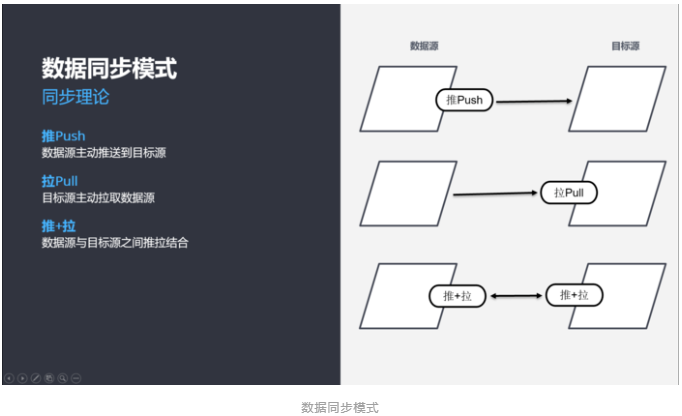 2、拉取模式,目标源定时去数据源拉取变更数据,如Mysql数据库的数据主从同步机制,Slave会去Master拉取变更数据。