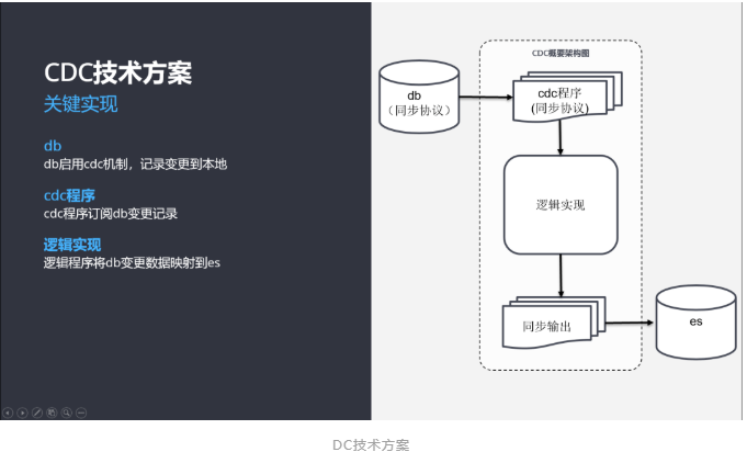 3、CDC,全称Change Data Capture,变更数据捕捉,从数据库内部捕捉变更数据,将变更数据推送到中间程序中,中间程序逻辑实现同步推送到ES。CDC机制速度极快,数据精准,且与应用程序耦合少,可抽象脱离业务系统,适合大规模使用。如图: