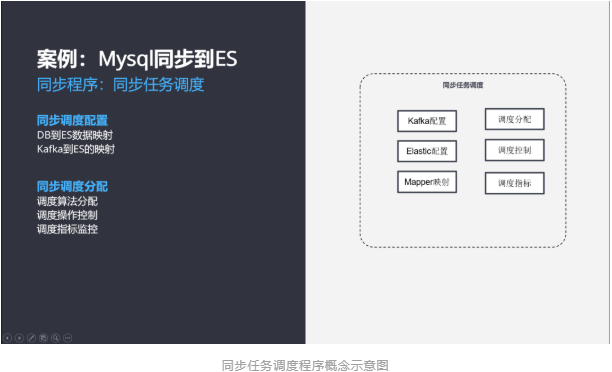 • 同步调度配置,配置同步任务,配置同步映射关系,DB到ES的映射,Kafka到ES的映射