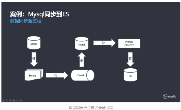 数据从DB更新到ES,中间经过多个环节,同步模式既有推送,也拉取,且多次结合完成。