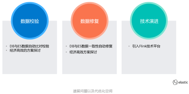 • 数据校验,DB数据虽然同步到ES中,但目前是没有有效的方法去校验正确性的,传统的方式校验方式是随机两边查询对比,非常的低效,此处需要探讨更好的数据比对方法,