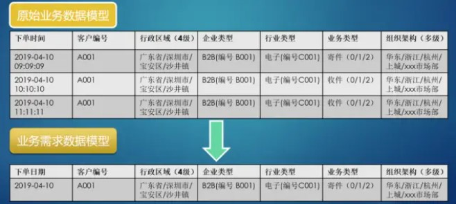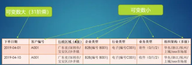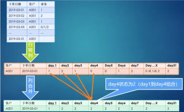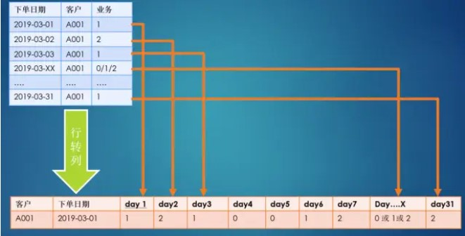 数据行转列:原有业务数据是按照行存储,聚合日期最小粒度是天, 单个客户下单信息除了下单日期、业务类型,其余的是相同的;将单个客户单月 31 天的下单数据 31 条转换成 1 条数据 31 列存储,31 列分表代表从下单日期往后叠加的日期,列存储的值代表当天是否有下单以及业务类型。