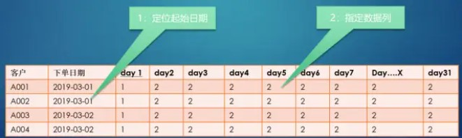 2、依据结束日期与起始日期差值,定位到指定的数据列;