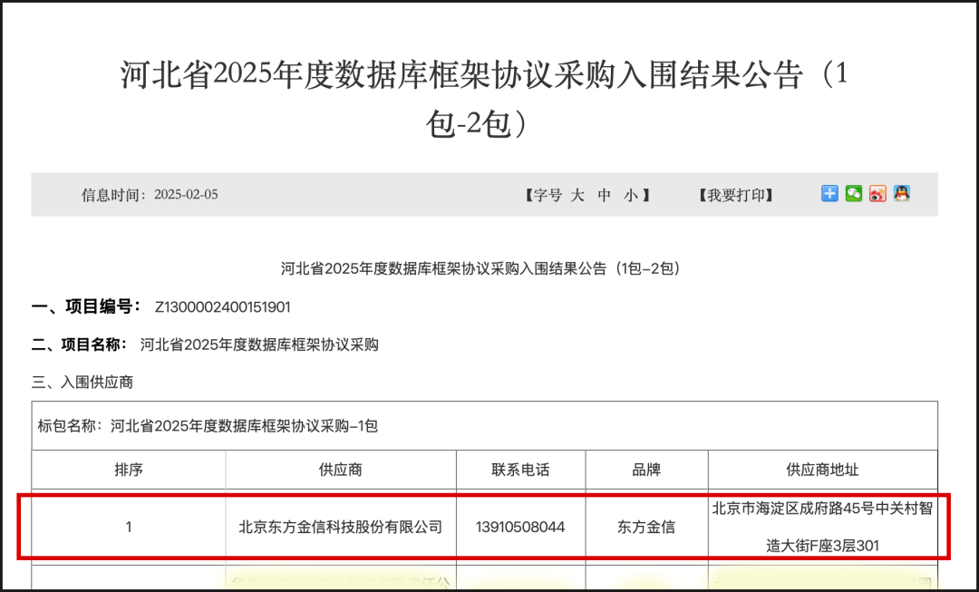 2025年2月5日,河北省公共资源交易中心公布了2025年度数据库框架协议采购的入围结果,东方金信公司凭借卓越的技术实力和市场口碑,成功入围,成为集中式数据库管理系统的主要供应商之一。