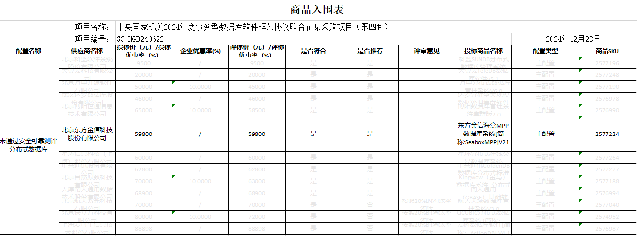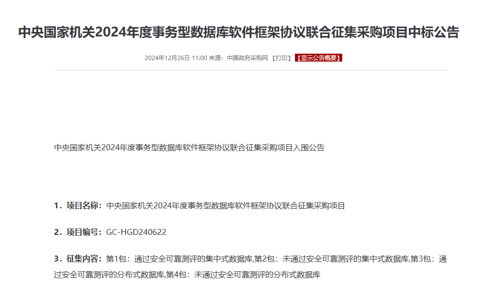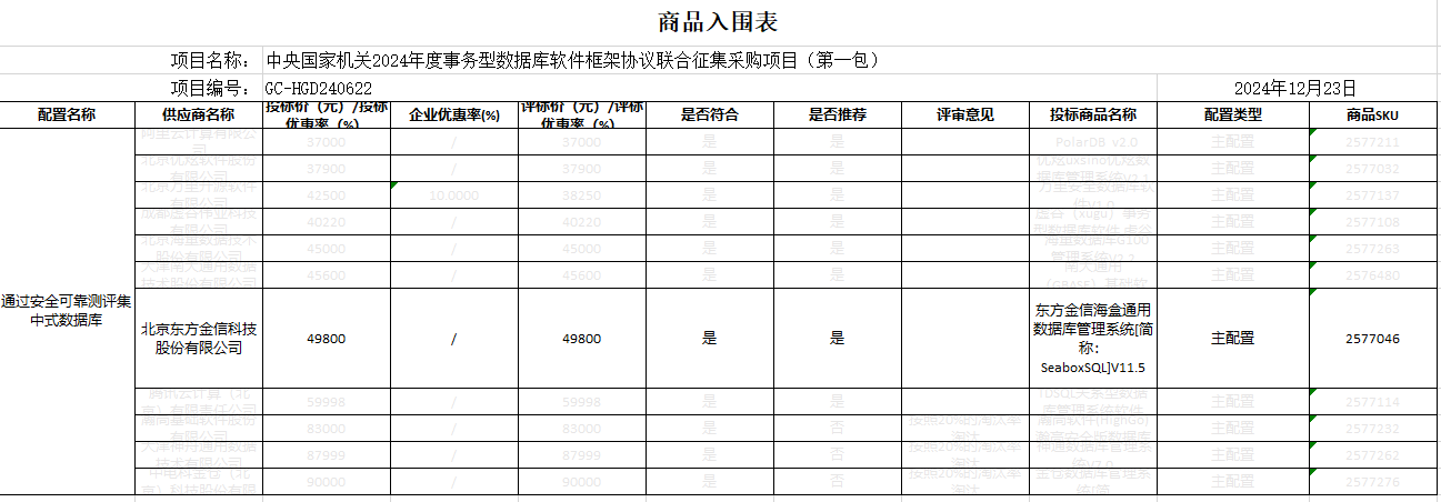 2024年12月26日,中央国家机关2024年度事务型数据库软件框架协议联合征集采购项目公布入围结果,东方金信海盒集中式数据库和分布式数据库双双入围!