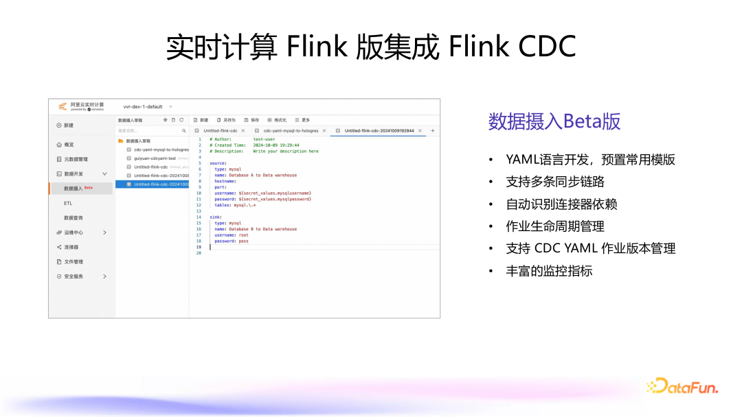 数据摄入 Beta 版:https://help.aliyun.com/zh/flink/user-guide/develop-a-yaml-draft?spm=a2c4g.11186623.help-menu-45029.d_2_2_3.53b92058TtBz1e&scm=20140722.H_2846225._.OR_help-V_1