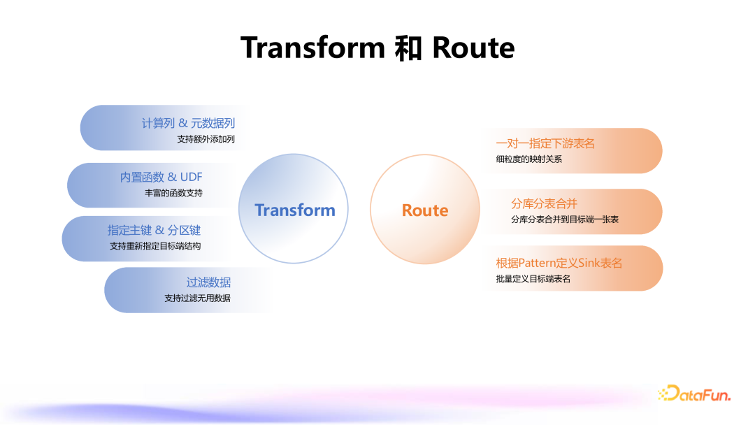 Transform 模块: 支持常见的计算列和元数据列添加(如 DATABASE、TABLE 等)。 提供丰富的内置函数,并支持用户定义 UDF(自定义函数)进行复杂计算。 对 Flink ScalarFunction 函数进行了兼容,简化了开发过程。 支持指定分区键或主键等下游存储所需的特定信息,以及对数据进行过滤和列裁剪。 Route 模块: 指定源到目标的映射关系支持一对一指定下游表名。 指定源到目标的映射关系支持多对一的映射,常用于分库分表合并的场景。 提供模式(Pattern)功能,允许批量定义下游表名,方便管理和展示。
