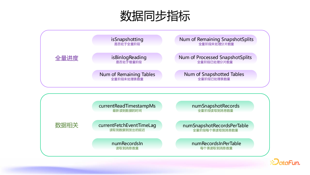时间方面指标: currentReadTimestampMs:最新读取到的数据时间戳,帮助了解数据同步延迟。 currentFetchEventTimeLag:常见 LAG 指标,衡量数据从源到目标的延迟。 数据量指标: numRecordsln:读取过程中的总数据量。 numRecordslnPerTable:每个表读取到数据量。 numSnapshotRecords、numSnapshotRecordsPerTable:对全量阶段读取的数据进行统计,便于数据审计和验证数据完整性。