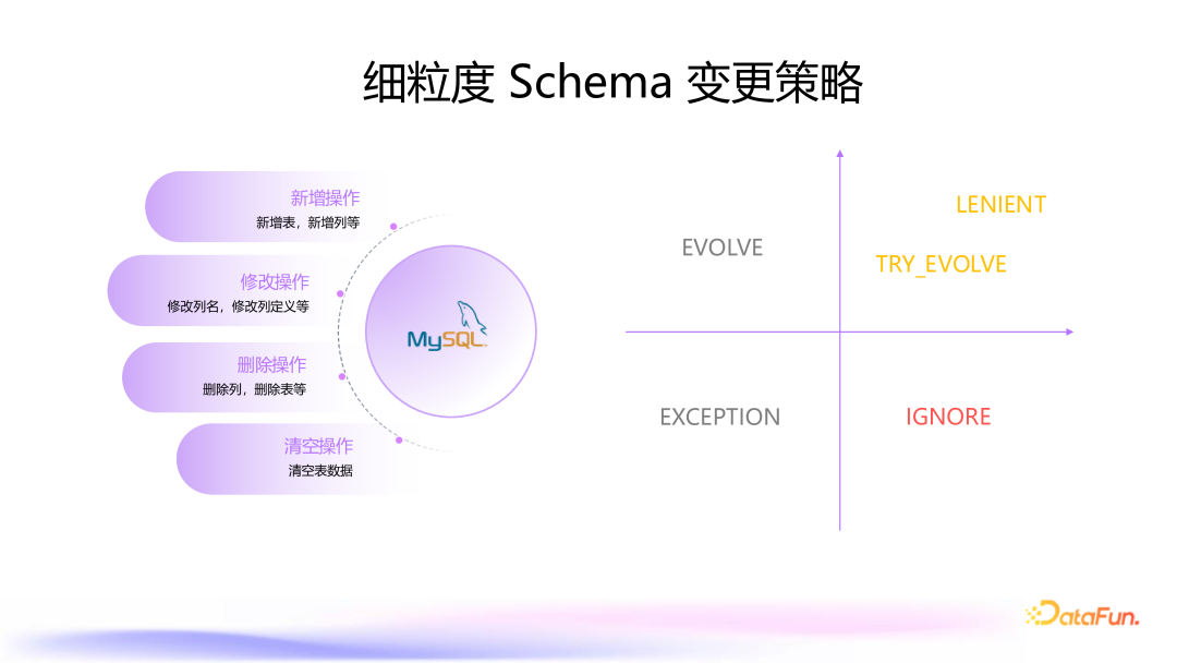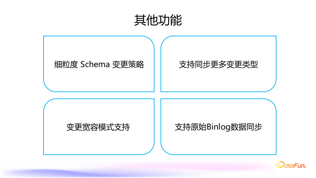 细粒度 Schema 变更策略:用户可以根据需求选择是否同步特定类型的变更操作(如 DELETE、DROP TABLE 等),避免不必要的数据操作影响下游系统。 支持同步更多变更类型:支持更多类型的变更,包括以前不被支持的操作(如 truncate table) 变更宽容模式支持 支持原始 Binlog 数据同步:支持将上游数据库的原始 Binlog Changelog 同步到下游系统,如 Kafka,以便于进一步处理。