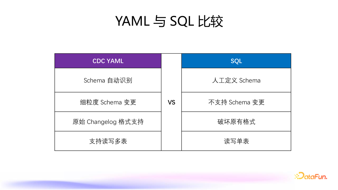 Schema 自动识别: CDC YAML:用户无需手动定义 schema,系统通过数据中的消息或强 schema 自动查询并识别 schema。 SQL 作业:需要用户手动定义和管理 schema。 细颗粒度 Schema 变更: CDC YAML:默认支持 schema 变更的自动同步,并提供细粒度的变更控制,允许用户灵活配置哪些变更操作应被同步。 SQL 作业:通常不支持实时 schema 变更同步,需要额外处理机制来捕获和应用这些变更。 原始 ChangeLog 格式支持: CDC YAML:传递的数据格式包括 schema change event 和 data change event,能够原生支持原始 Changelog 的同步到下游。 SQL 作业:无法直接处理原始 Binlog Changelog。 CDC YAML 支持读写多表,SQL 仅支持读写单表