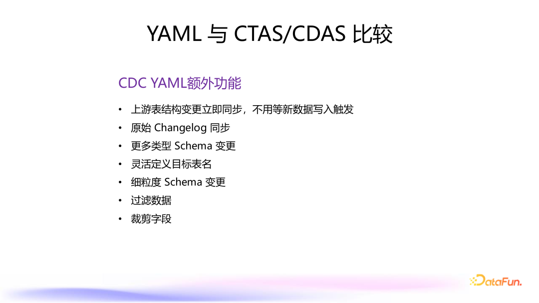 Schema 变更支持: YAML 支持上游表结构变更时立刻同步到下游,而 CTAS/CDAS 需要等待下一条数据写入才能触发结构变更。 原始 Changelog 变更支持: YAML 能够支持原始 Changelog 变更。 表名定义灵活性: YAML 允许灵活定义下游表名,可以针对每张表单独设置。 细粒度 Schema 变更: YAML 支持细粒度的 Schema 变更、裁剪列和过滤数据等功能。