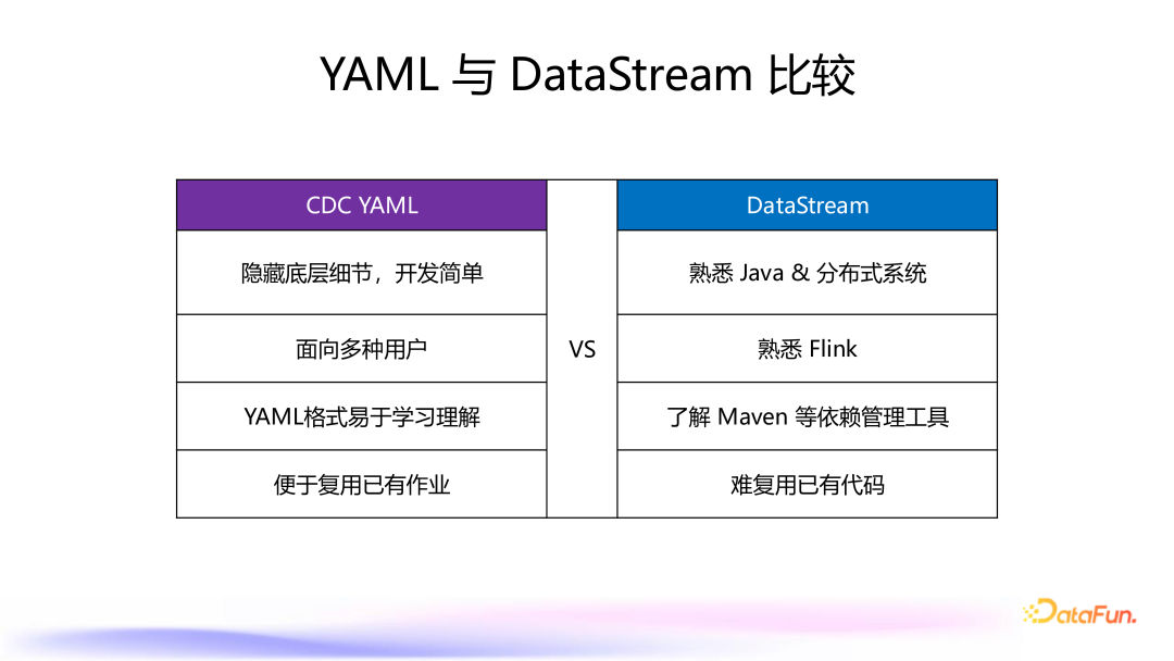 隐藏底层细节,开发简单: YAML 作业隐藏了底层实现细节,通过 YAML 文件进行配置,使得用户更容易理解和操作。 面向多种用户,YAML 格式易于学习理解: YAML 设计面向多用户,无需深入了解 Java 分布式系统或 Flink,降低了使用门槛。 便于复用已有作业: YAML 简化了开发流程,用户无需编写复杂的 DataStream 代码即可实现数据同步。