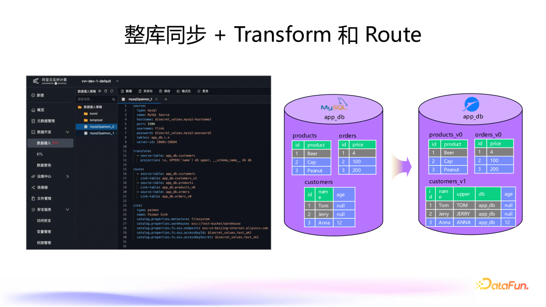 例如,在 app_db 数据库中有三张表,通过定义 source 和 sink,以及在 source 的 tables 部分使用正则表达式匹配所有表,可以实现整库同步。 当进入增量阶段时,例如在 orders 表中添加一个 amount 列,该结构变更也会同步到下游的数据库中。