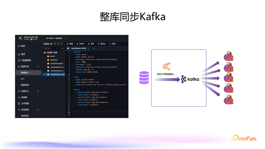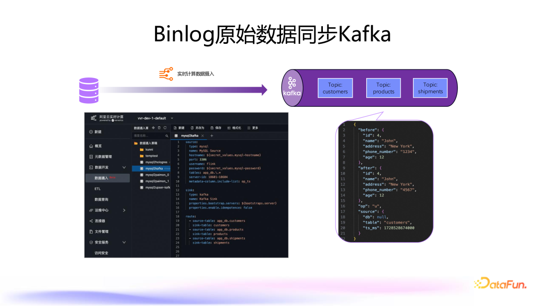支持将 MySQL 上游的 binlog 变更数据同步到 Kafka,用于 changelog 审计或数据回放。 支持 Debezium JSON 和 Canal JSON 两种常用的 changelog 格式。