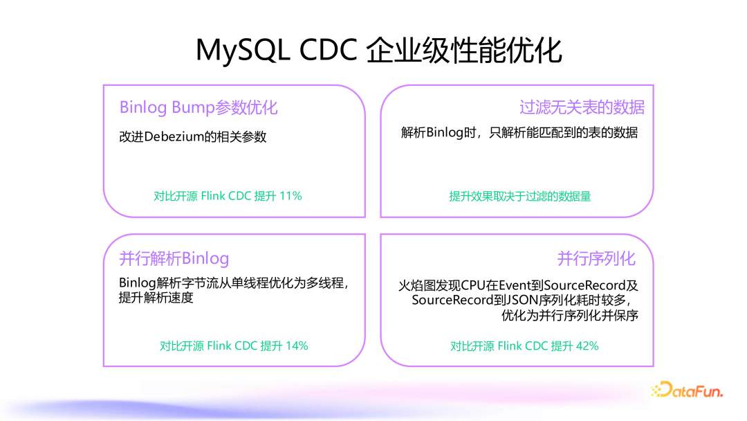 我们对解析 Binlog 的过程进行了并行化优化,这包括了解析和序列化两个阶段。这两个阶段是数据处理中的耗时部分,优化后能够分别提升性能 14% 到 42%。