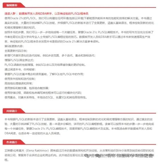 数据库新手、软件开发者、数据库管理员,或是想提升数据库编程技能的技术爱好者,都能从《Oracle PL/SQL 实例精解(原书第 6 版)》中挖掘宝藏。若你想在 Oracle 数据库开发领域更进一步,它就是你的不二之选。在数据库技术飞速发展的当下,掌握 PL/SQL 这门强大语言,就是为个人竞争力续航。选择这本书,踏上高效实用的学习之旅,一同探寻 Oracle PL/SQL 的魅力,为职业发展注入强劲动力!