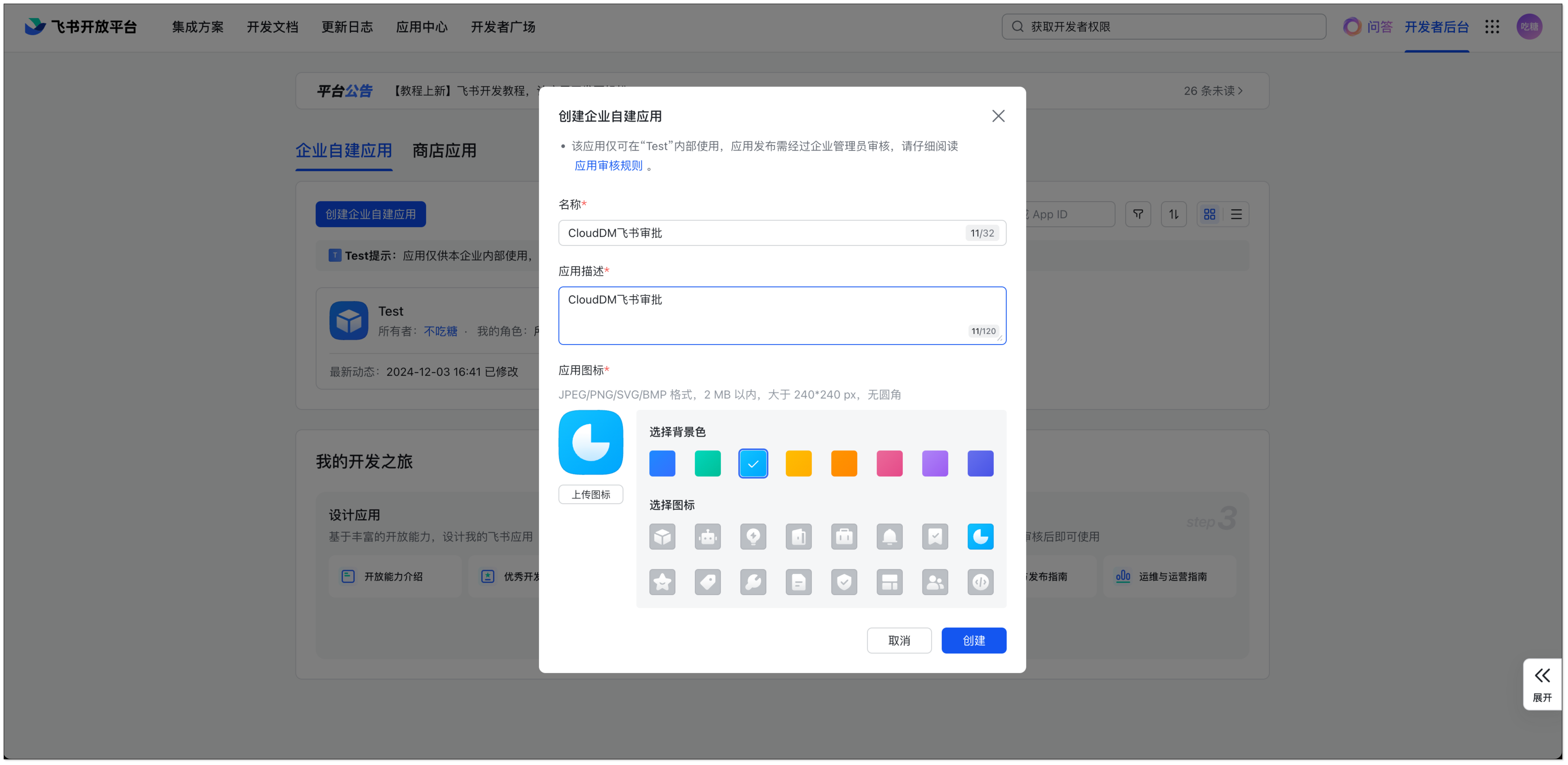 点击 创建企业自建应用,填写应用基础信息,并点击 创建。