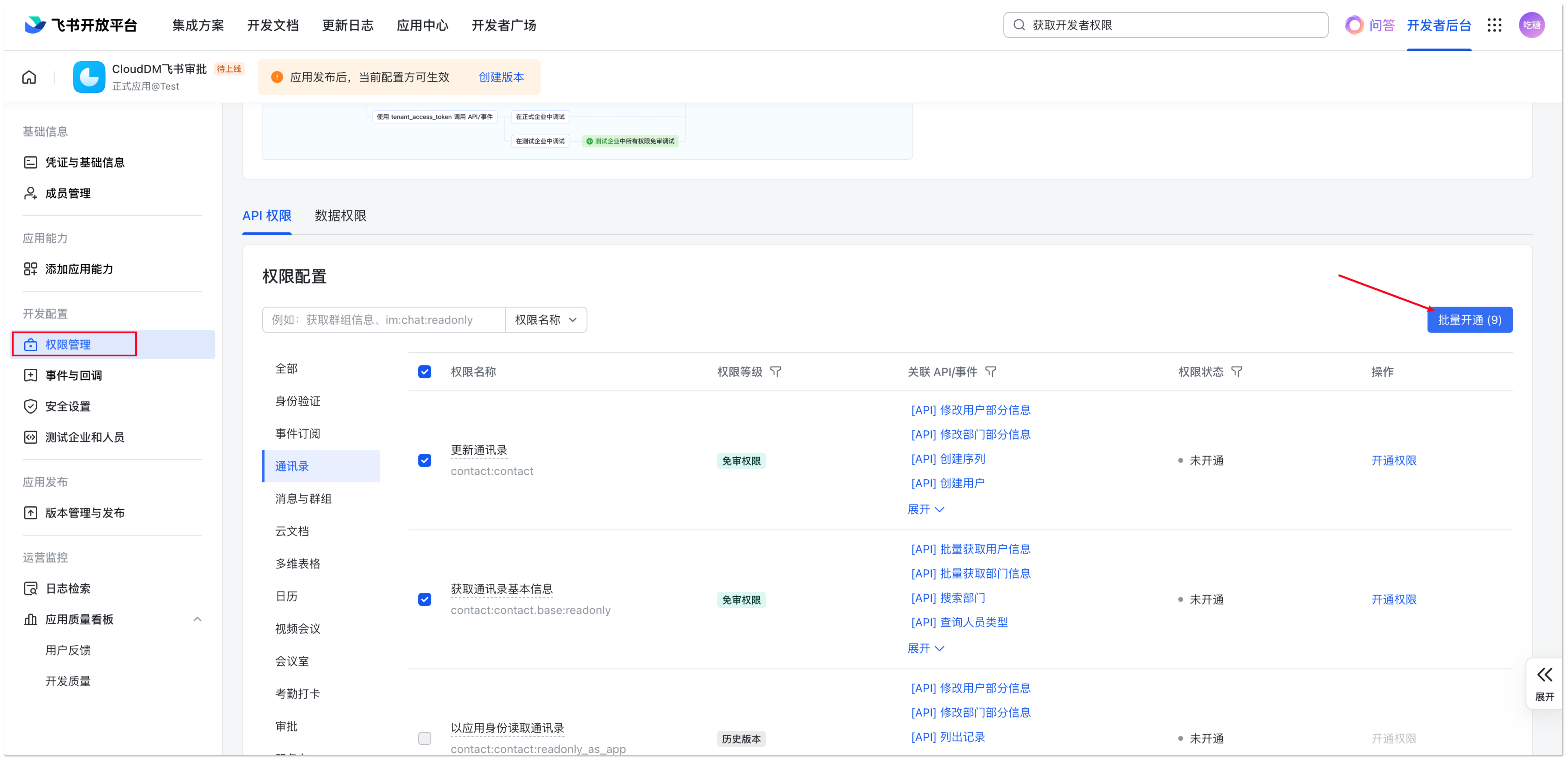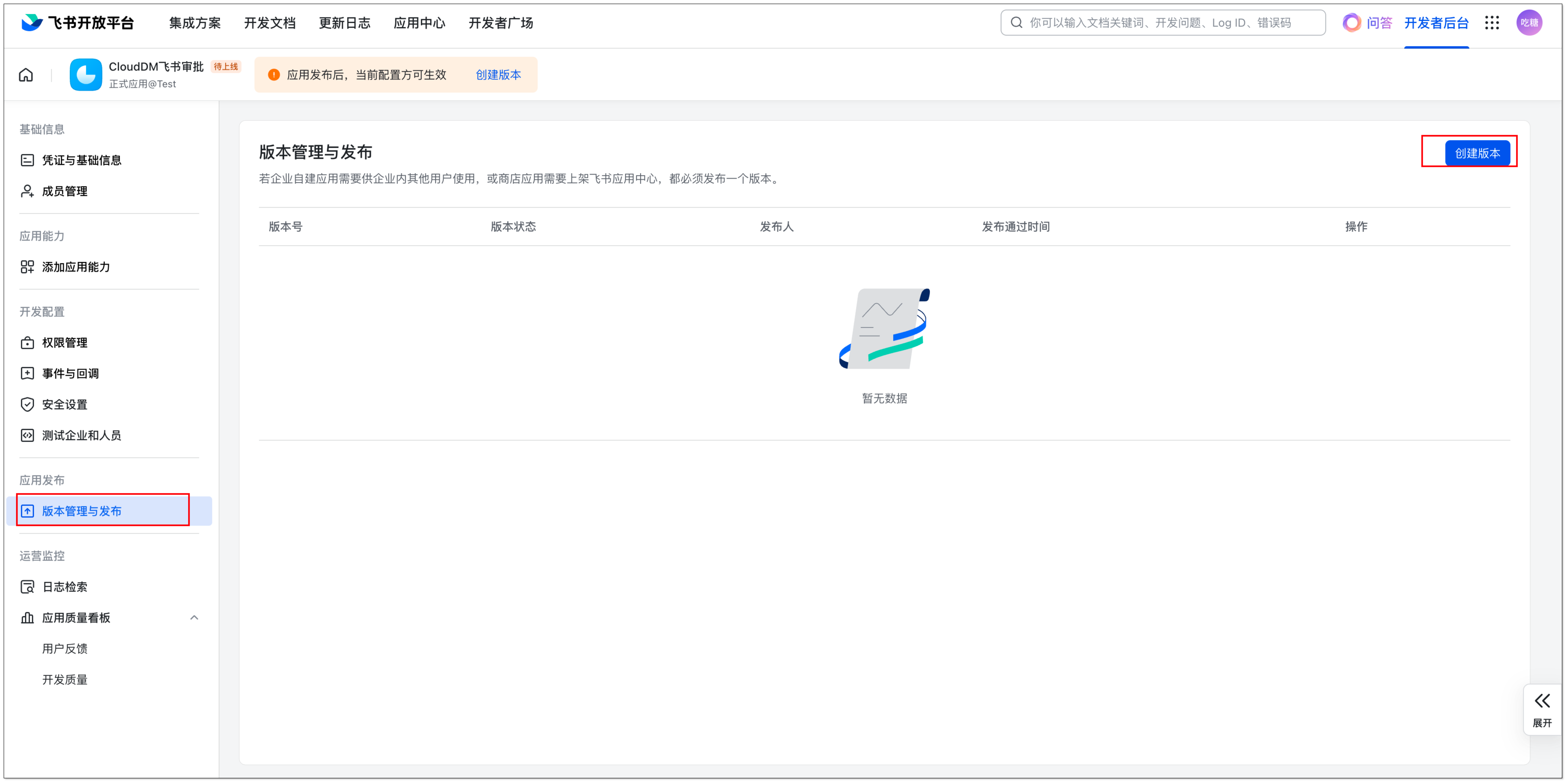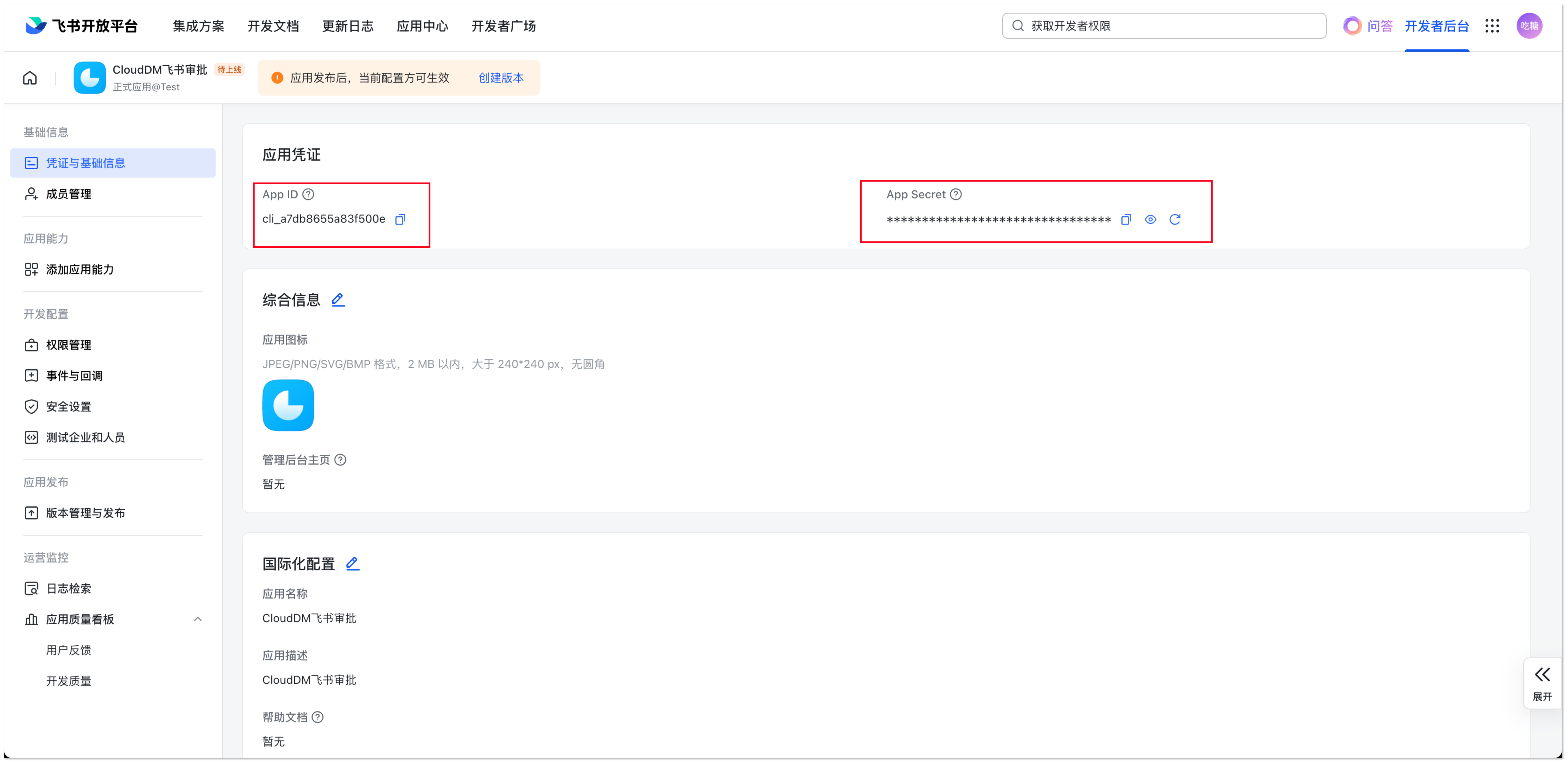 - 点击 凭证与基础信息,复制 App ID、App Secret,为 CloudDM Team 配置作准备。