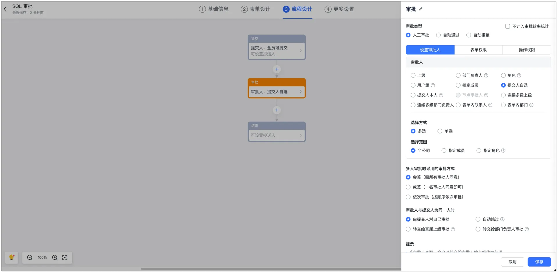 在 流程设计 的步骤,设置各节点的审批人及审批方式。只支持指定审批人或系统自动选择,不支持发起人自选。