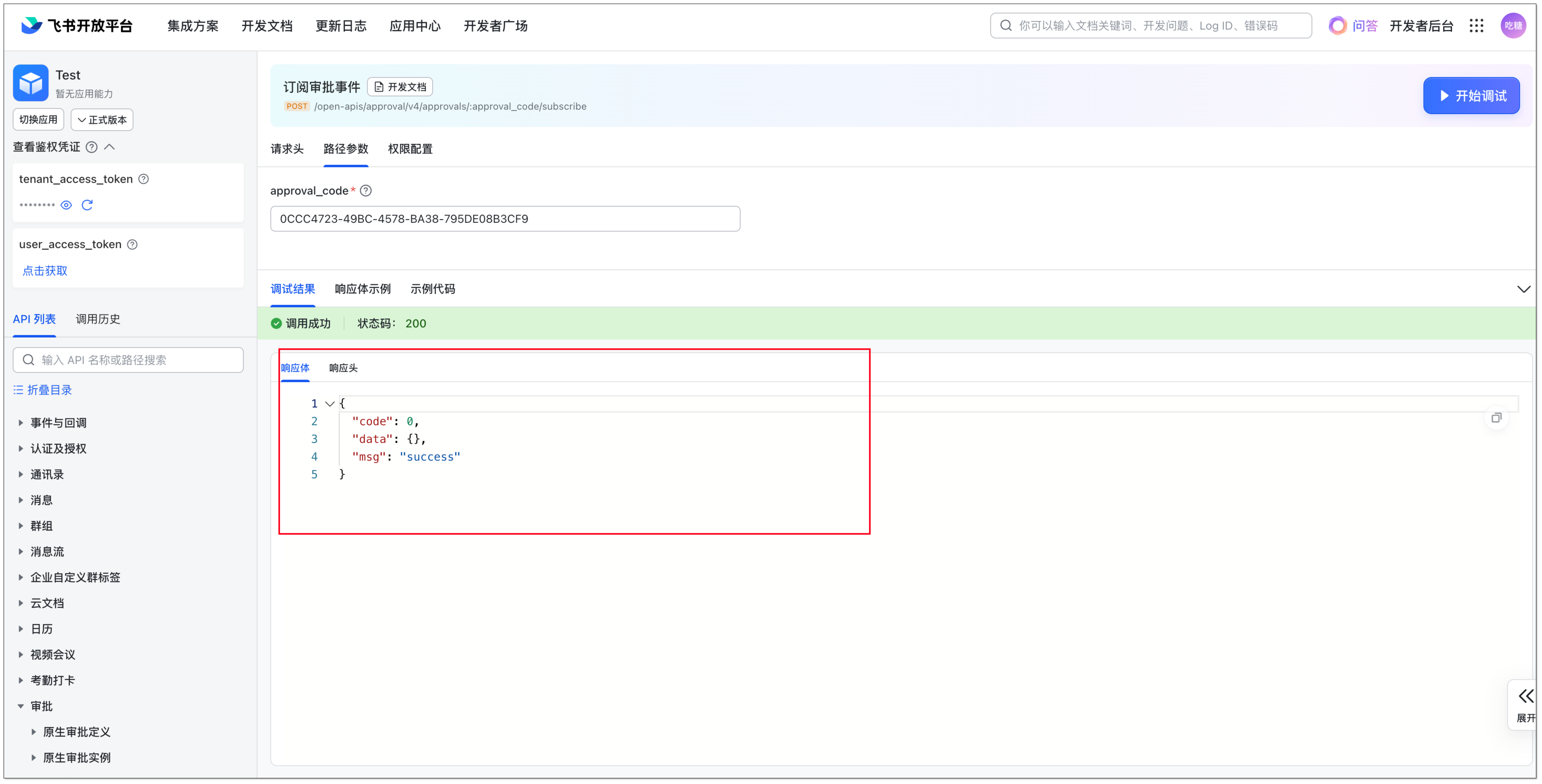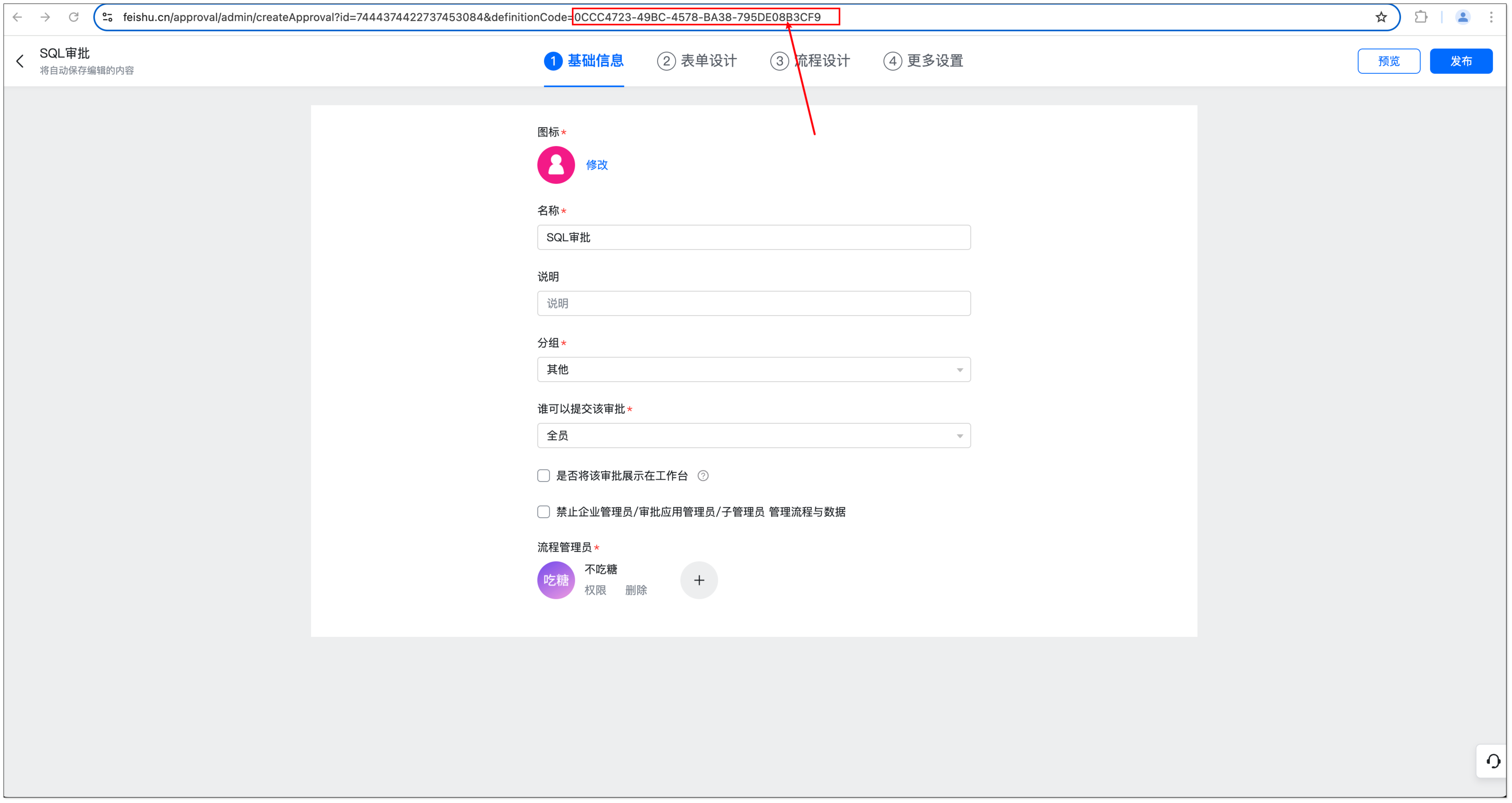 将 App ID 复制到 feishuApprovalAppID、App Secret 复制到 feishuApprovalAppSecret、definitionCode 复制到 feishuApprovalTemplateList(如有多个审批模版码,使用