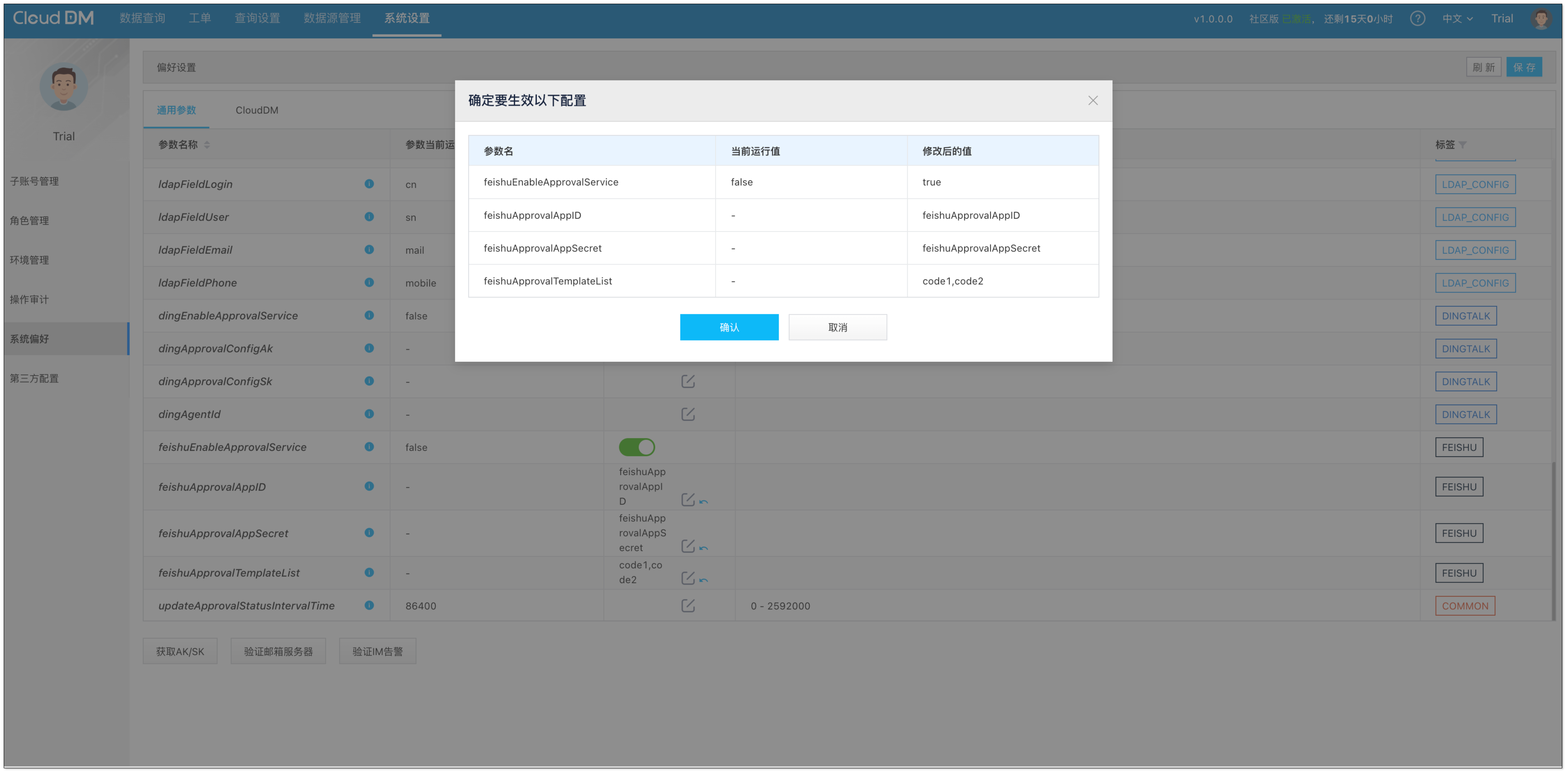 ,分隔),并修改 feishuEnableApprovalService 参数值为 true。