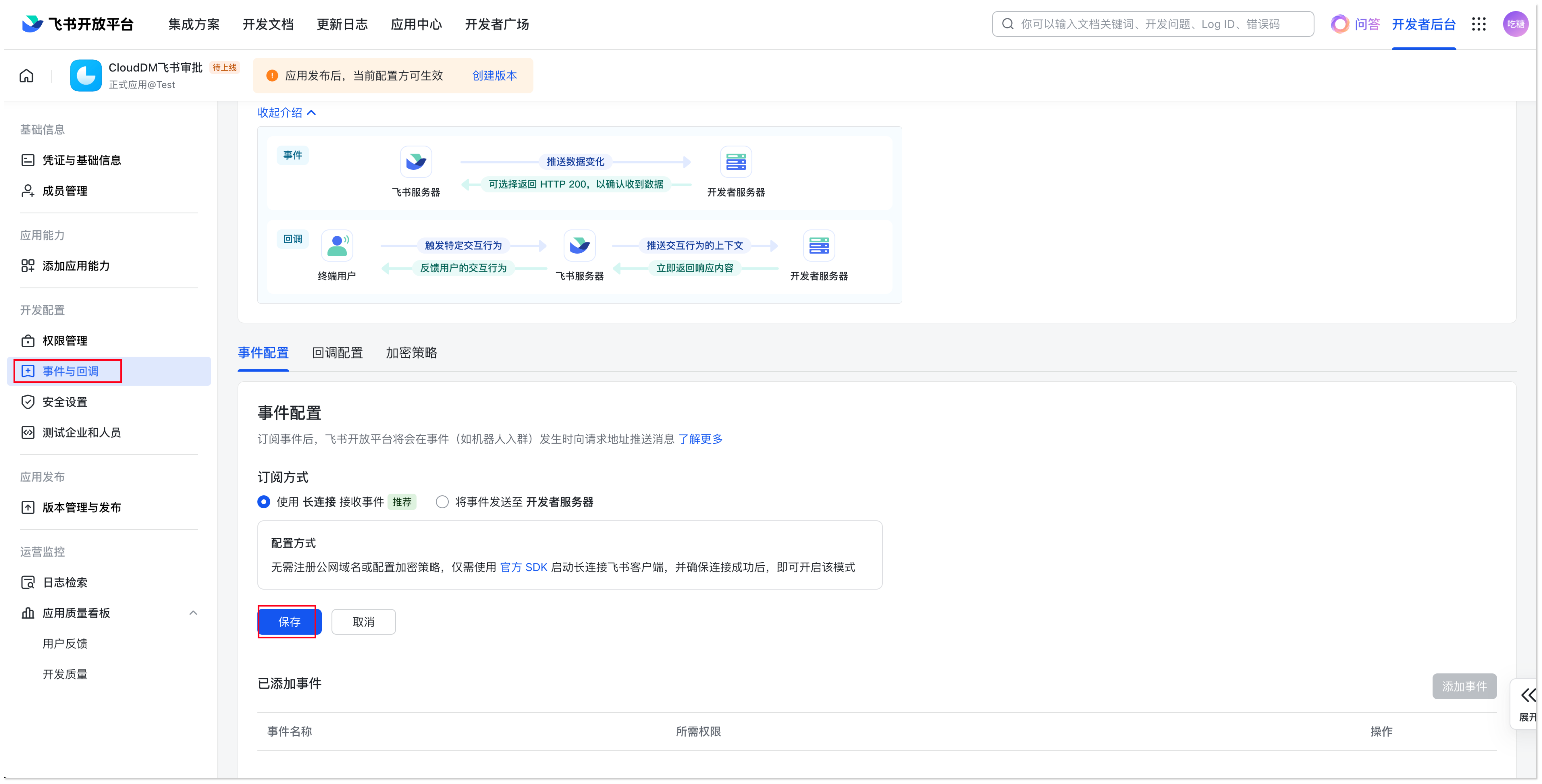 - 订阅方式选择 使用长连接接收事件,点击 保存。