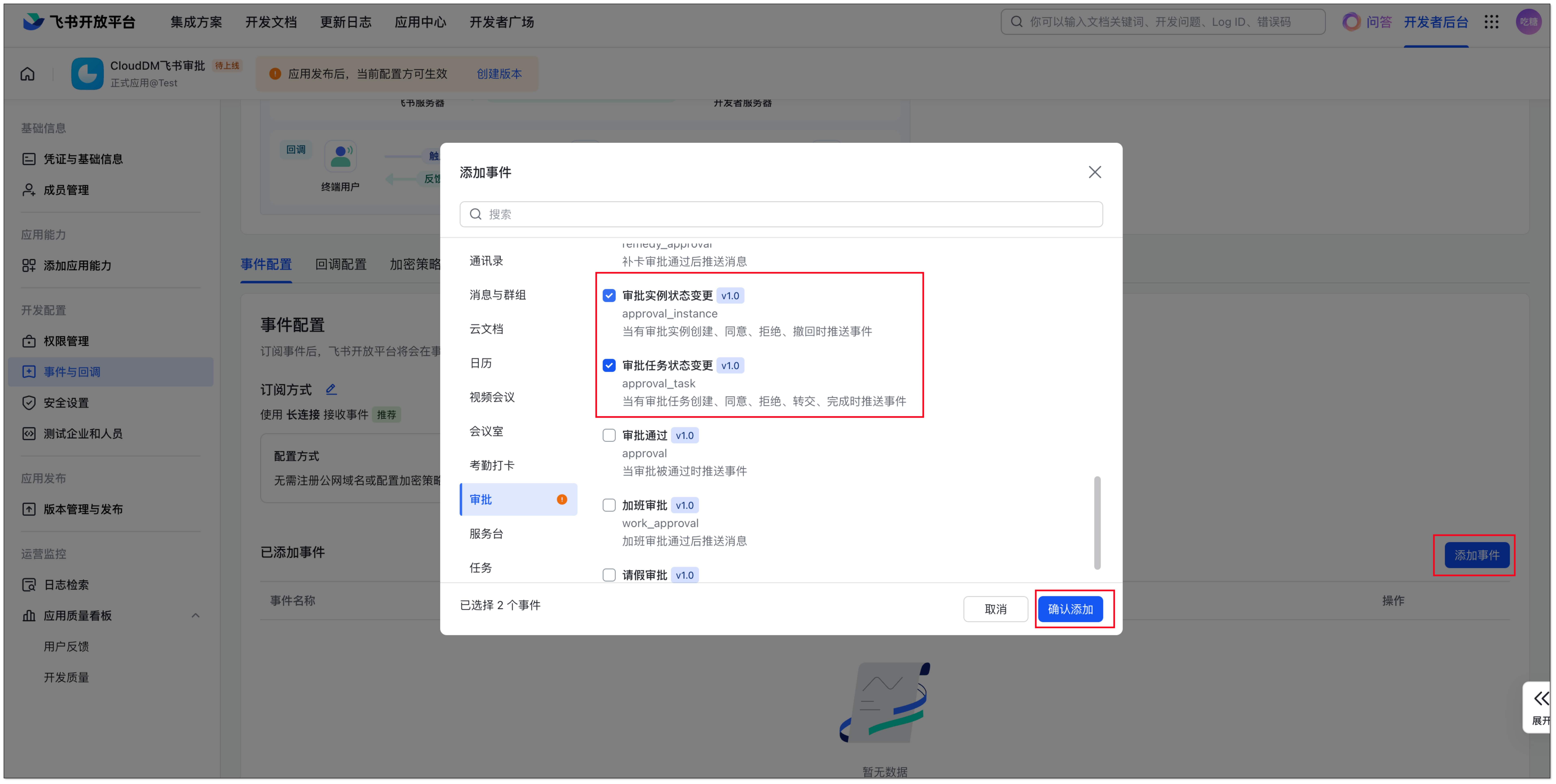 - 点击 添加事件。添加 审批实例状态变更 和 审批任务状态变更 事件。
