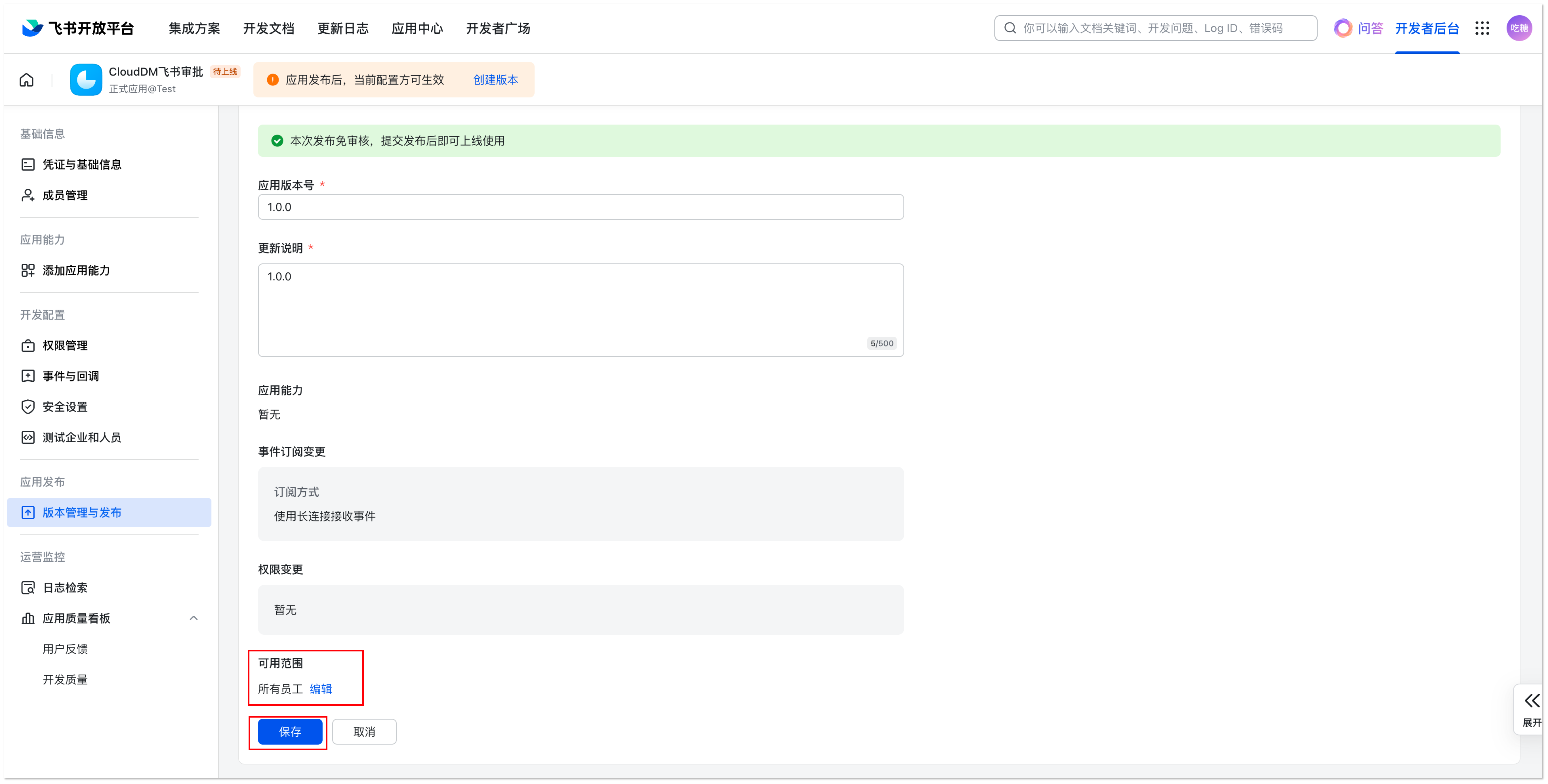 填写版本基础信息,应用可用范围选择 所有员工,并点击 保存。
