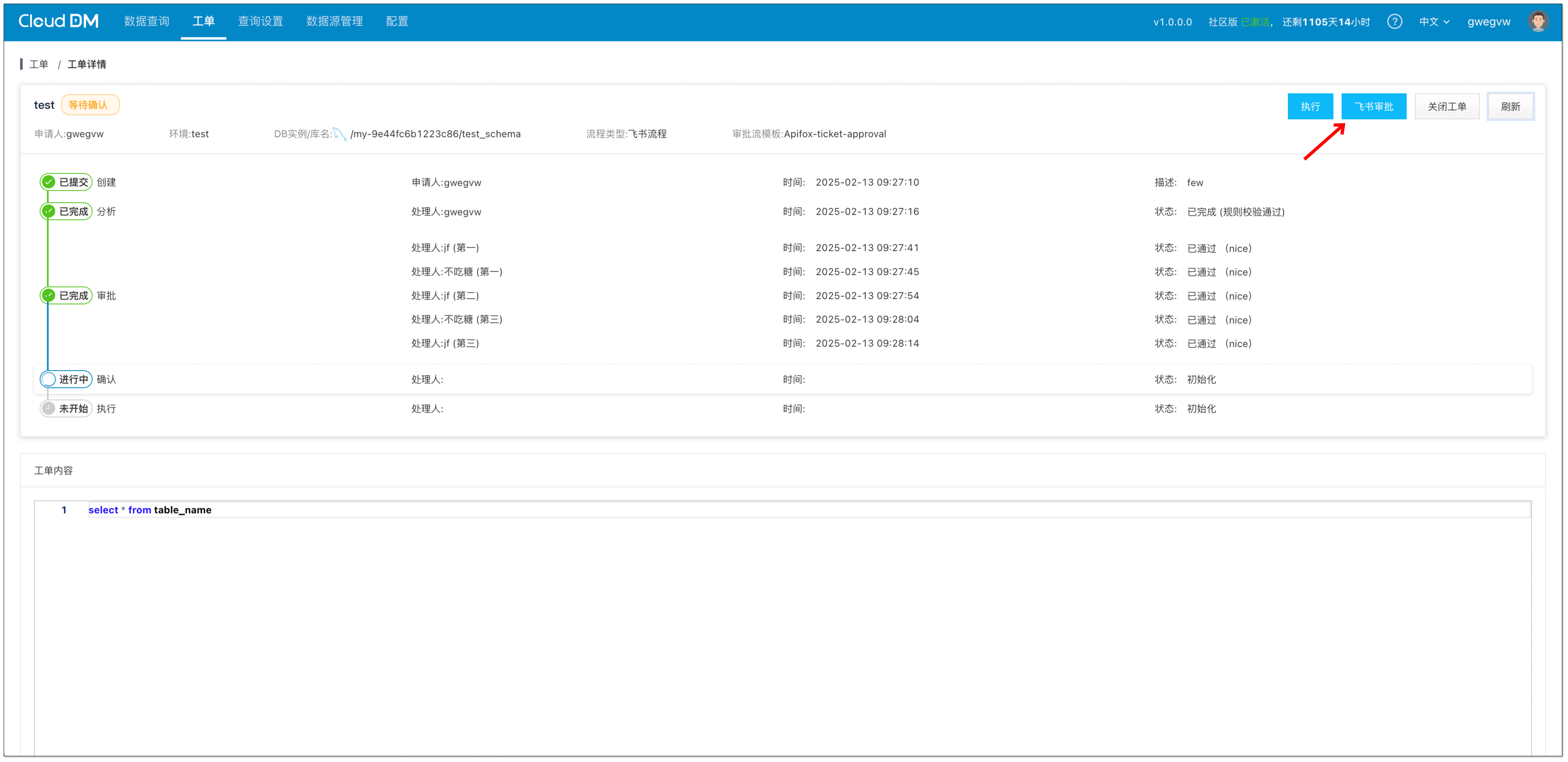 提交工单后,点击右上角 飞书审批,即可跳转到飞书审批页面。