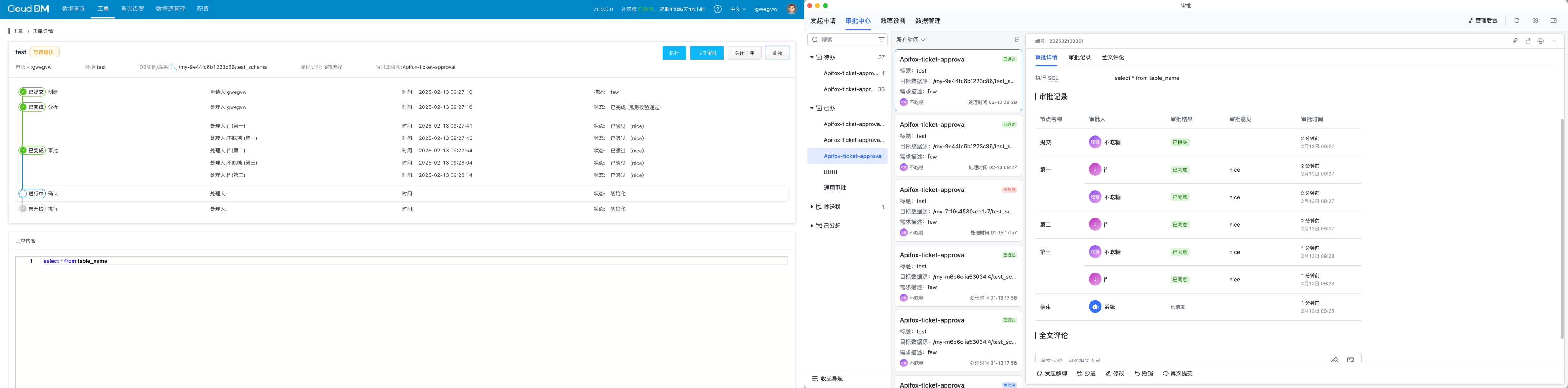 CloudDM 是一个专为团队协同工作打造的数据库数据管控平台。在管控数据库安全变更的过程中,为提高效率,方便用户使用,CloudDM 接入了主流 OA 协同办公系统(包括钉钉、飞书、企业微信),支持实时通知与移动办公,满足广大企业用户的实际需求。