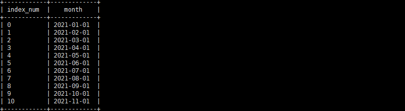 selectindex_num,add_months(start_month,index_num) as monthfrom(selecttrunc('2021-01-25','MM') as start_month,trunc('2021-11-26','MM') as end_month,abs (cast(months_between(trunc('2021-01-25','MM'),trunc('2021-11-26','MM')) as int )) as num_month)tmplateral view posexplode(split(space(num_month)," ")) k as index_num,data