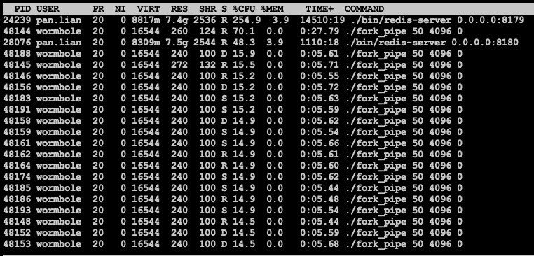 pipe不加锁, 显然CPU利用率更高(全部耗在sys上了), 且出现大量D状态的进程, 和此前线上观察到的情况一致, 这一点值得深究