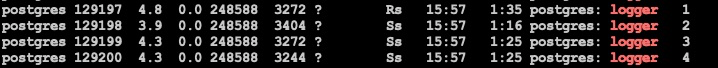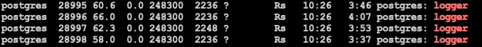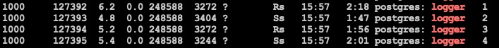 可见性能还不够理想, 我们的目标是将整体损失降到10%以内, 仔细观察思考了一下, 有两点值得深入做下优化, 一是syslogger CPU占用率比较高, 4个syslogger进程每个都在90%左右, 二是看代码发现PG拼日志字符串的框架比较重, 存在多次内存拷贝.