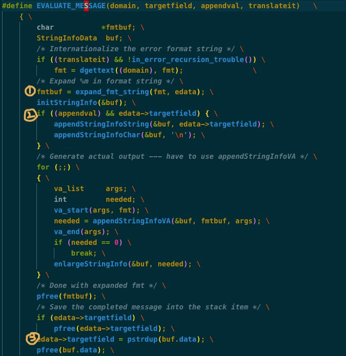 仔细看代码, PG的elog框架实现效率比较低, 不仅路径长, 中间存在多次buffer copy, 仅这一小段代码就存在三次内存申请释放及拷贝的情况
