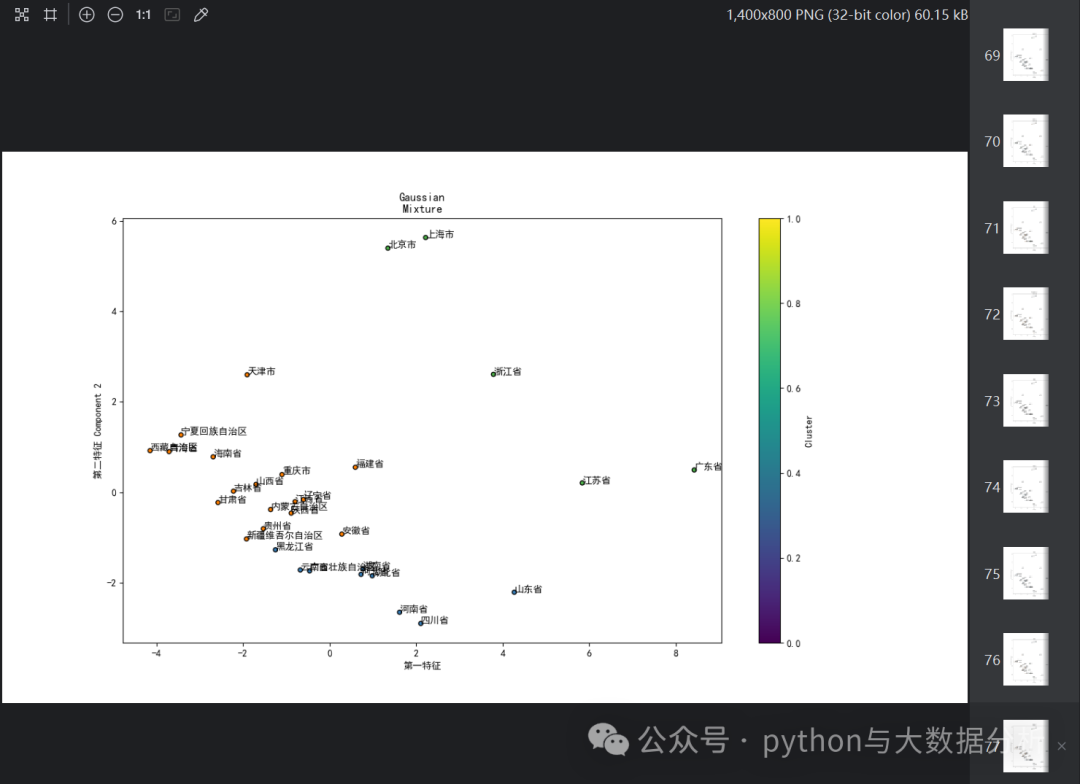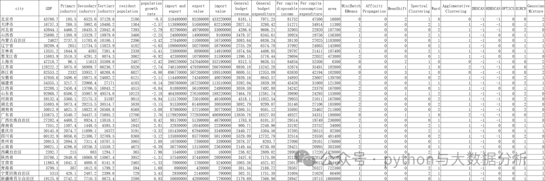 # 导入库import pandas as pd # panda库import matplotlib.pyplot as pltfrom sklearn.preprocessing import StandardScaler # 标准化库from sklearn.cluster import KMeans # 导入sklearn聚类模块from sklearn.metrics import silhouette_score # 效果评估模块from sklearn.decomposition import PCAimport matplotlibfrom sklearn import cluster, datasets, mixturefrom sklearn.neighbors import kneighbors_graphimport timeimport warningsimport numpy as npfrom itertools import cycle, islice# 替换为你的文件路径data_path = r'E:\JetBrains\PythonProject\DeepLearning\provicedata.csv'df = pd.read_csv(data_path)# 选择特征列features = ['GDP', 'Primary industry', 'Primary industry','Primary industry','resident population','population growth rate','import and export','export value','import value','General budget revenue','General budget expenditure','Per capita disposable income','Per capita consumption expenditure','area'] # 替换为你的特征列名X = df[features]n_samples, n_features = X.shapeprint('样本数:%d , 特征数:%d' % (n_samples, n_features))# sklearn.cluster.KMeans(n_clusters=K)# 1. n_cluster:聚类个数(即K),默认值是8。# 2. init:初始化类中心的方法(即选择初始中心点的根据),默认“K-means++”,其他可选参数包括“random”。# 3. n_init:使用不同类中心运行的次数,默认值是10,即算法会初始化10次簇中心,然后返回最好的一次聚类结果。# 4. max_iter:单次运行KMeans算法的最大迭代次数,默认值是300。# 5. tol:浮点型,两次迭代之间簇内平方和下降的容忍阈值,默认为0.0001,如果两次迭代之间下降的值小于tol所设定的值,迭代就会停下。# 6. verbose:是否输出详细信息,参数类型为整型,默认值为0,1表示每隔一段时间打印一次日志信息。# 7. random_state:控制每次类中心随机初始化的随机种子,作用相当于能够锁定和复现同一次随机结果,默认为none,也可以随机设置数字。# 8. copy_x:在预先计算距离时,首先将数据居中在数值上更准确。如果 copy_x 为 True(默认),则不修改原始数据。# 如果为 False,则修改原始数据,并在函数返回之前放回,但通过减去再添加数据均值可能会引入小的数值差异。# 请注意,如果原始数据不是C-contiguous,即使copy_x 为False,也会进行复制。如果原始数据是稀疏的,但不是 CSR 格式,即使 copy_x 为 False,也会进行复制。# 9. algorithm:有三种参数可选:auto”, “full”, “elkan”,默认为auto。K-means 算法使用。# 经典的EM-style算法是“full”。通过使用三角不等式,“elkan” 变体对具有明确定义的集群的数据更有效。# 然而,由于分配了一个额外的形状数组(n_samples,n_clusters),它更加占用内存。# 数据归一化scaler = StandardScaler()scalerX = scaler.fit_transform(X)for i in range(2,5):# 1.components_ :特征空间中的主轴,表示数据中最大方差的方向。组件按排序 explained_variance_# 2.explained_variance_:它代表降维后的各主成分的方差值。方差值越大,则说明越是重要的主成分# 3.explained_variance_ratio_:它代表降维后的各主成分的方差值占总方差值的比例,这个比例越大,则越是重要的主成分# 4.singular_values_:每个特征的奇异值,奇异值等于n_components 低维空间中变量的2范数# 5.mean_:每个特征的均值# 6.n_components_:即是上面输入的参数值# 7.n_features_:训练数据中的特征数量# 8.n_samples_:训练数据中的样本数# 9.noise_variance_:等于X协方差矩阵的(min(n_features,n_samples)-n_components)个最小特征值的平均值pca = PCA(n_components=i)pcaX = pca.fit_transform(scalerX)print("For n_components={}, The PCA explained_variance_ratio_ is {}".format(i, pca.explained_variance_ratio_))# For n_components=2, The PCA explained_variance_ratio_ is [0.54113074 0.30908829]# For n_components=3, The PCA explained_variance_ratio_ is [0.54113074 0.30908829 0.06978044]# For n_components=4, The PCA explained_variance_ratio_ is [0.54113074 0.30908829 0.06978044 0.04070103]pca = PCA(n_components=2)pcaX = pca.fit_transform(scalerX)