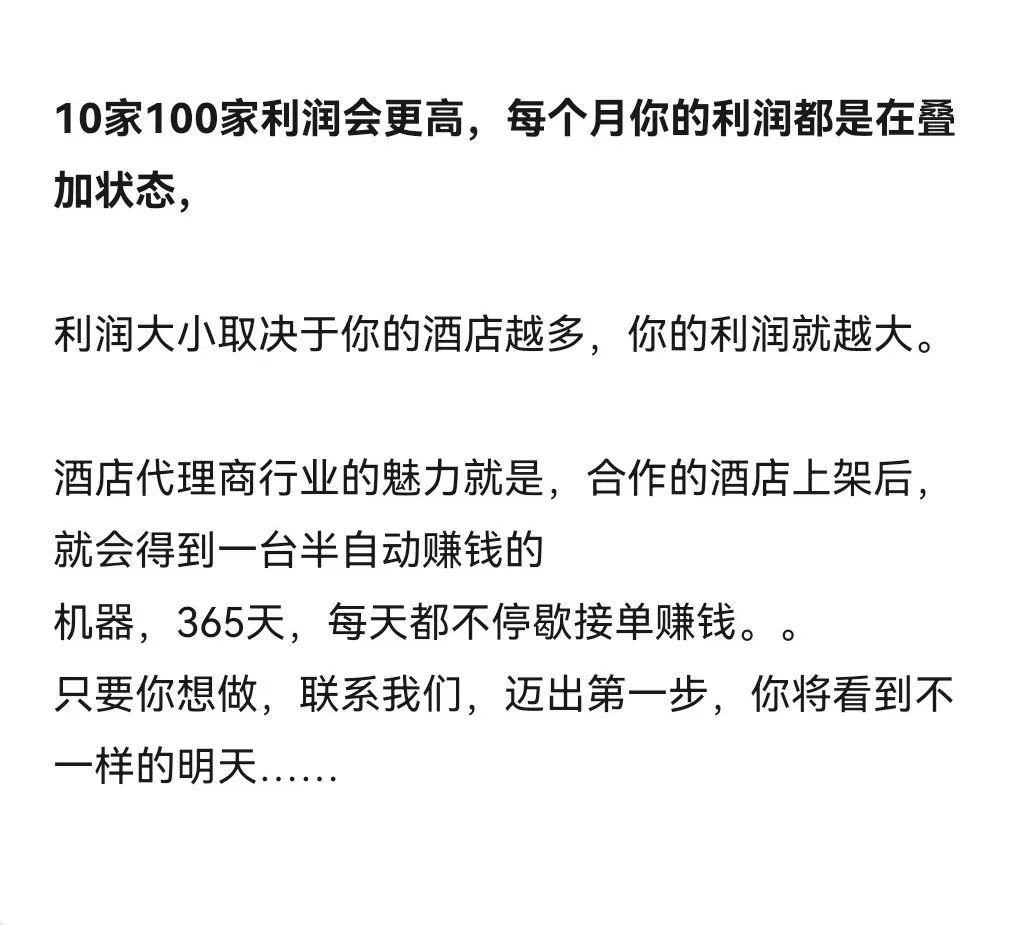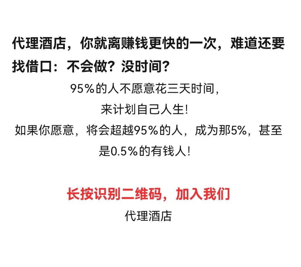 无论您是家庭主妇丶创业丶工薪族丶白领丶待业者。即使你没经验、没背景、没学历、没产品、没技术,都没关系,手机操作就能代理酒店,当今不代理酒店,五年后你必将后悔!机会只属于有胆识的人!敢想!敢要!敢得到!数字化时代趋势势不可挡。