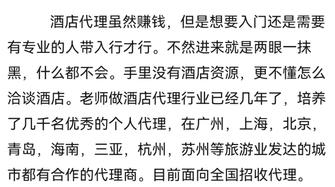 这就是为什么酒店代理需要专业的老师带我们迅速入门,深入浅出的讲解洽谈选店与操作技巧,全程指导,精准扶持,灵活避开各种坑。