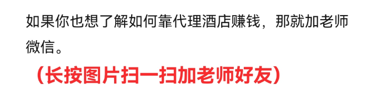 如果您不想给别人打工一辈子,想自主创业, 但是找不到合适的项目! 那就不如多加一个微信代理酒店 ,白手起家,来打造自己的一份事业!