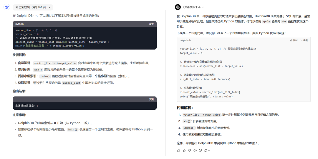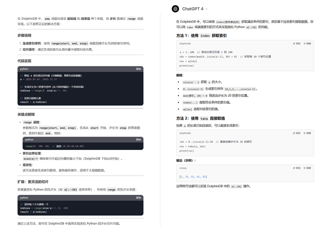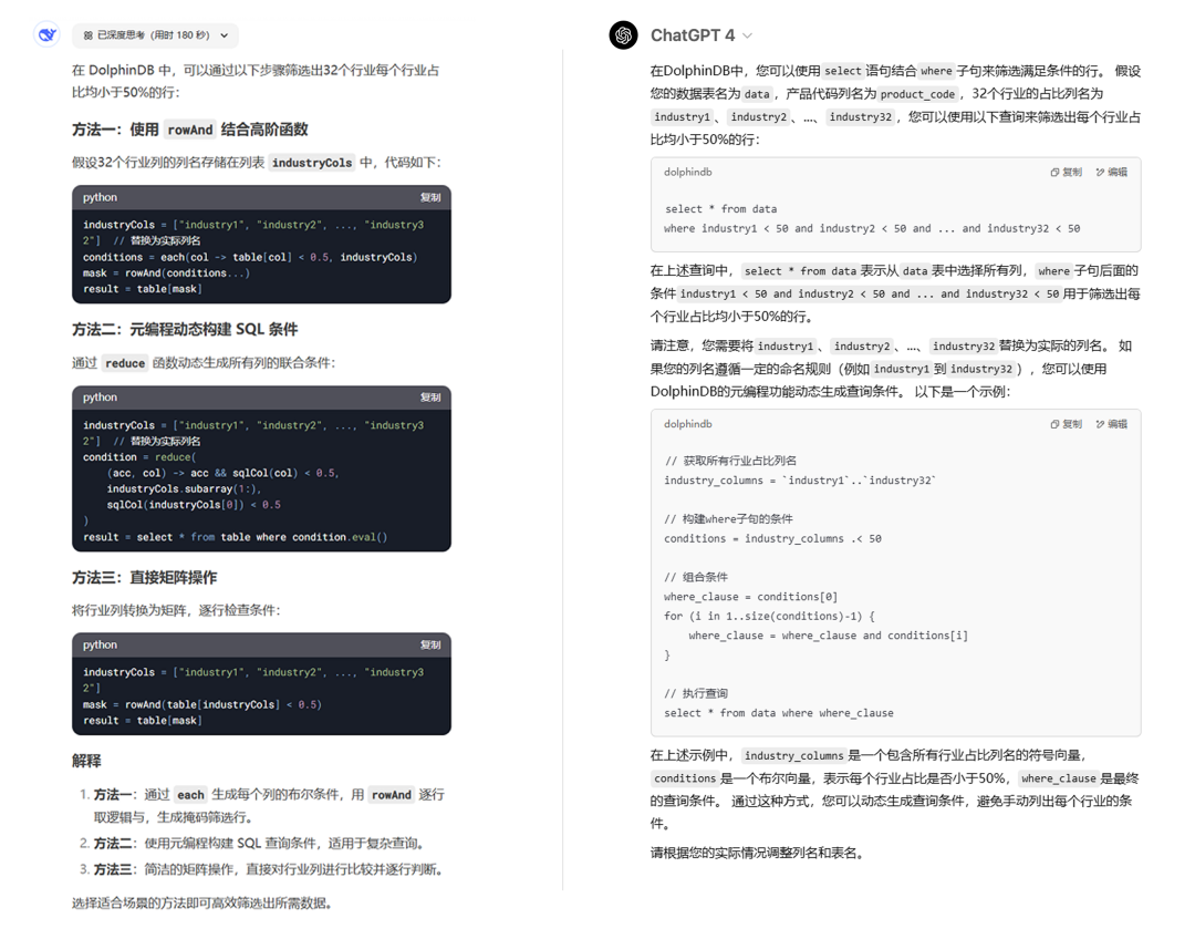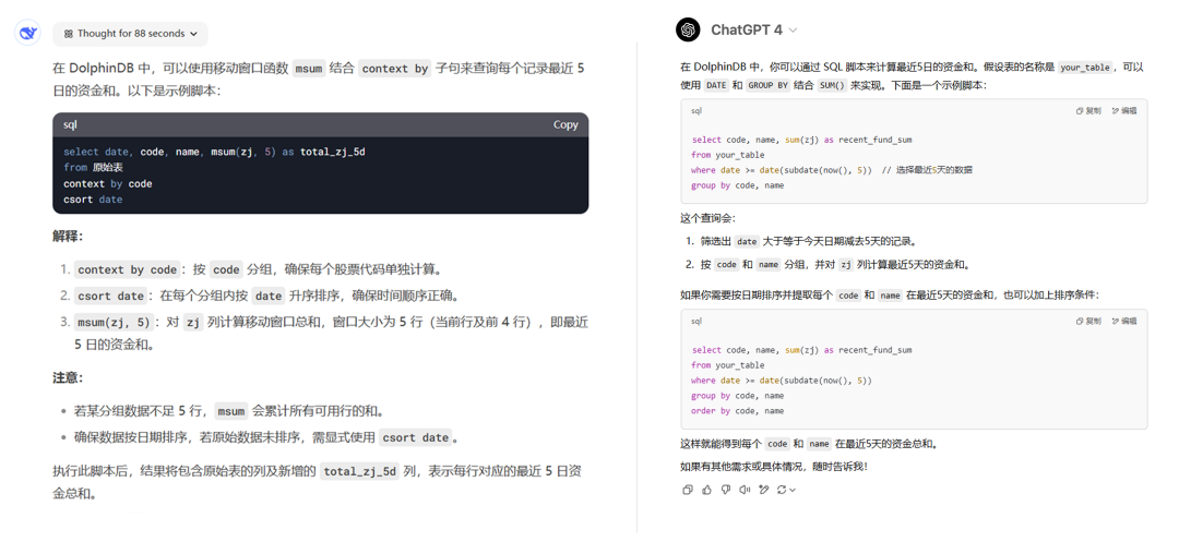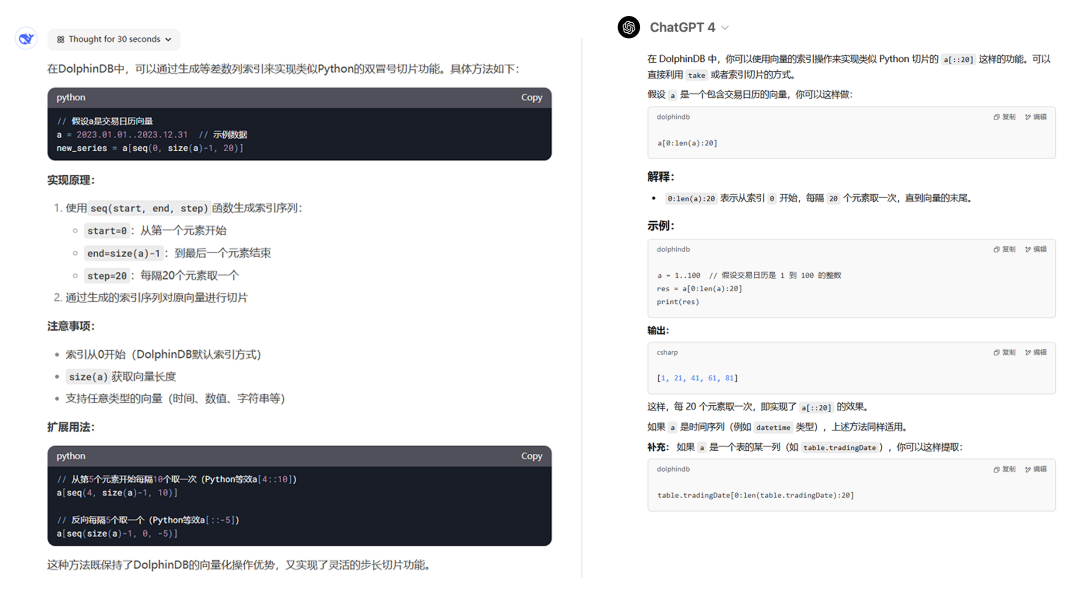 综合来看,DeepSeek-R1在技术适配性上表现更优,其大概率能提供符合 DolphinDB 语法规范的可行方案。GPT-4 虽然展现了流畅的自然语言表达能力,但在对 DolphinDB 的了解,以及技术细节的处理上存在短板,需要多次修正才能接近正确答案。