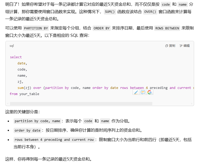 GPT 第一次生成的回答有误,用户希望得到每一条记录最近五天的资金总和,而 group by 每个分组只返回一条结果。