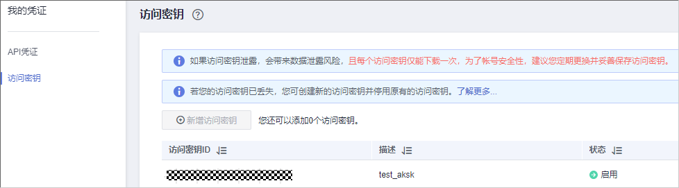 $AK,$SK:登录云“控制台”,单击右上角用户名,进入“我的凭证”,选择“程序密钥”,通过“新增访问密钥”创建AK与SK,创建完成后下载密钥(即AK与SK)
