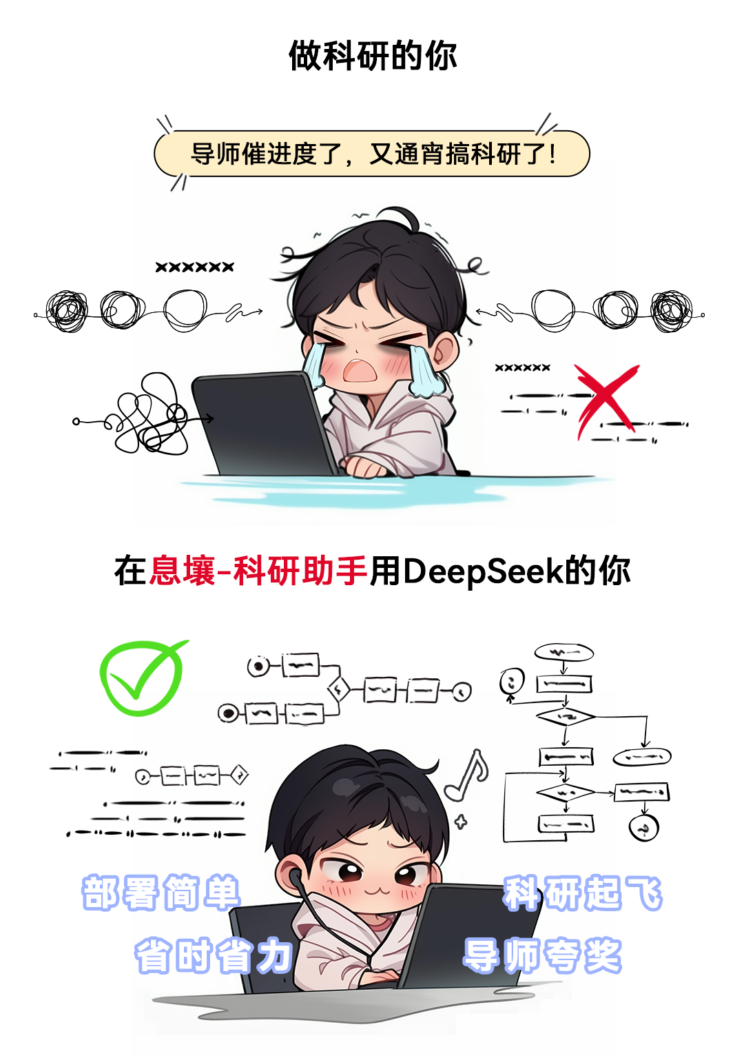 目前,息壤-科研助手已支持DeepSeek推理模型,高校师生可利用该平台快速开展科研实验,学习、研究DeepSeek先进技术,也可借助DeepSeek快速检索学术资源、辅助文献阅读与分析、处理实验数据、生成代码片段,提升学习和研究效率,还可以结合DeepSeek快速开发智能应用。