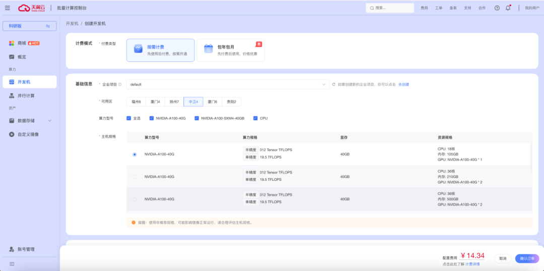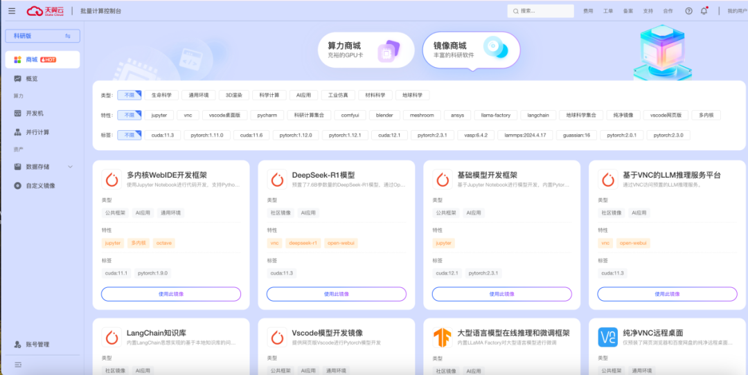 通过天翼云官网进入科研助手产品控制台,在商城中选购所需的算力资源或镜像软件。算力商城中有各个可用区丰富的算力资源和各类资源的配置,镜像商城中有各类科研领域所需的科研镜像(例如Vscode、JupterLab、DeepSeek)。另外,平台也在不断同步更新更多的镜像软件,如DeepSeek-R1推理模型、Dify模型应用开发平台或AnythingLLM模型应用开发平台,用户可按需选购。