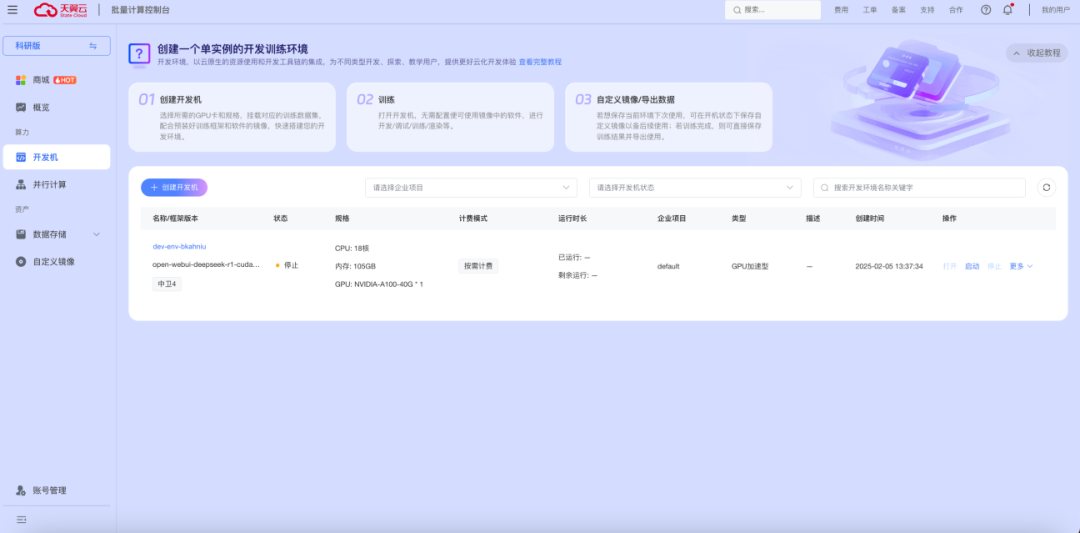 下单成功的开发机可以在开发机列表中查看,点击启动和打开按钮即可启动和使用该开发机。