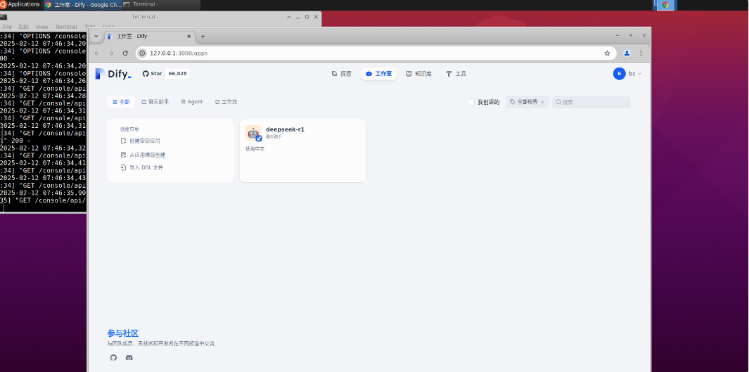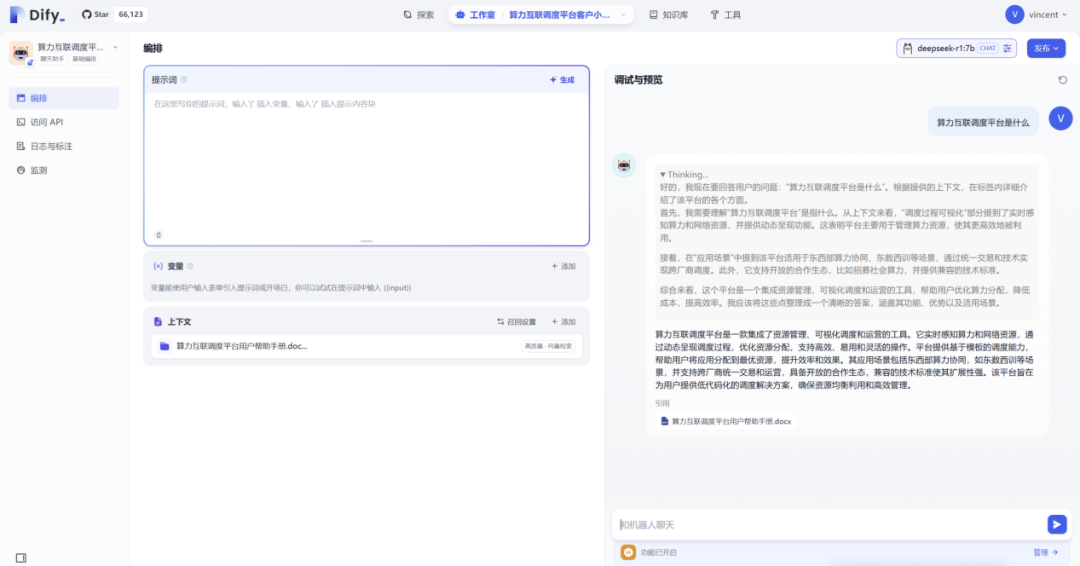 点击启动Dify图标,将自动部署Dify服务。部署完成后将自动弹出Dify页面,用户可在Dify中上传本地知识库,并通过DeepSeek-R1进行知识问答,搭建属于自己的专属知识问答小助手。