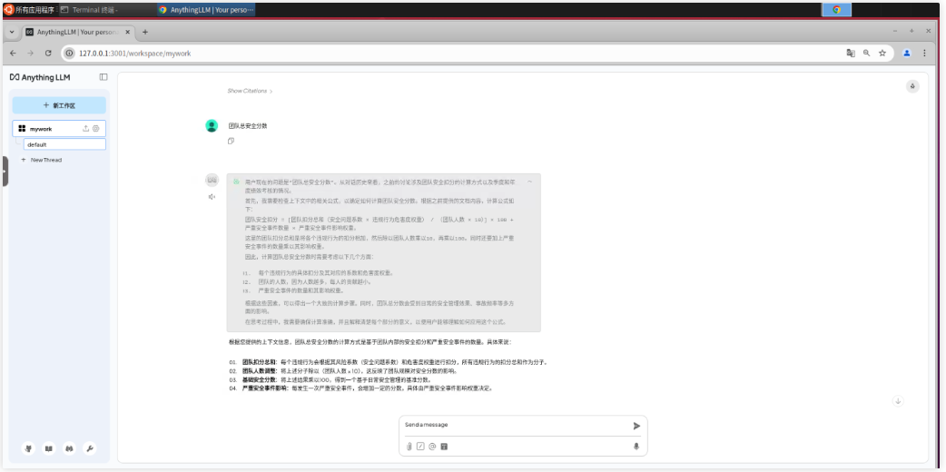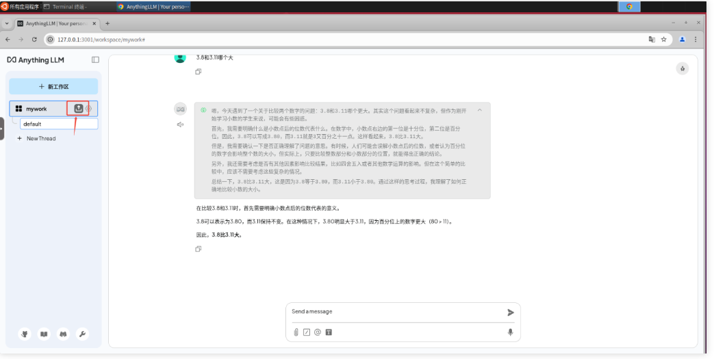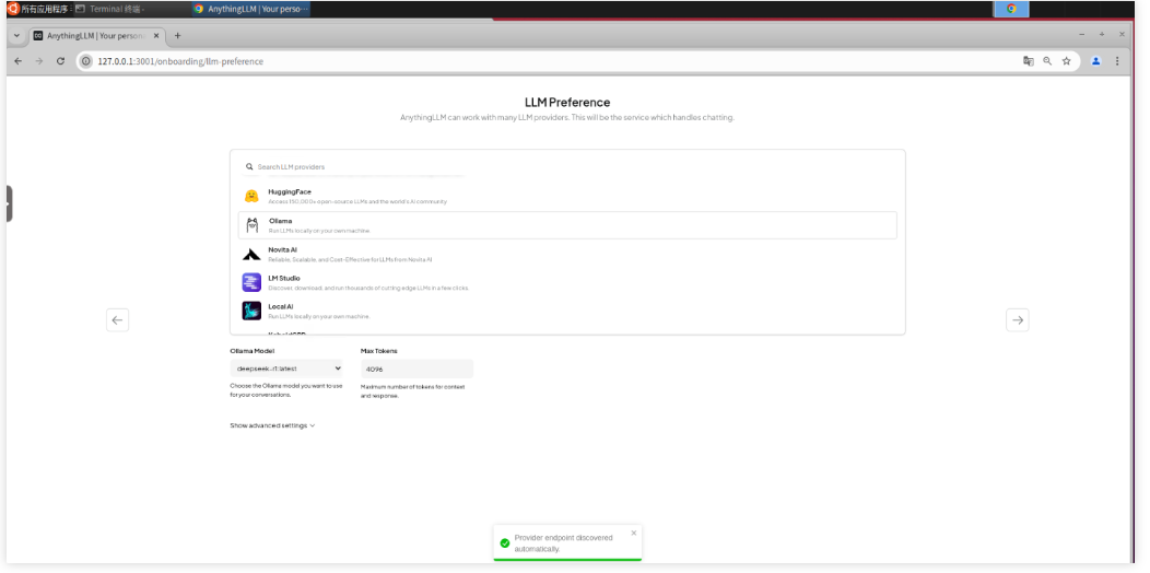 点击启动AnythingLLM图标,自动部署服务,在LLM列表中找到“Ollama”,选中后可看到Ollma Model中默认选择了DeepSeek-R1模型。创建一个工作区,在工作区中即可体验DeepSeek模型,用户可将知识库文档导入AnythingLLM中,完成知识库的查询问答。