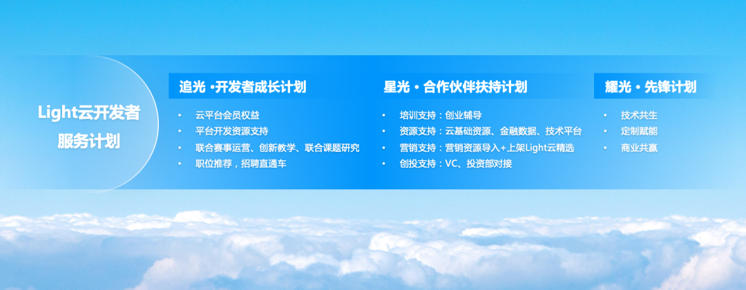与此同时,从今年开始,恒生将持续推出“星光计划”、“追光计划”和“耀光计划”三款服务计划,希望让更多参与者参与到金融创新上来,共建金融行业的开发者生态。