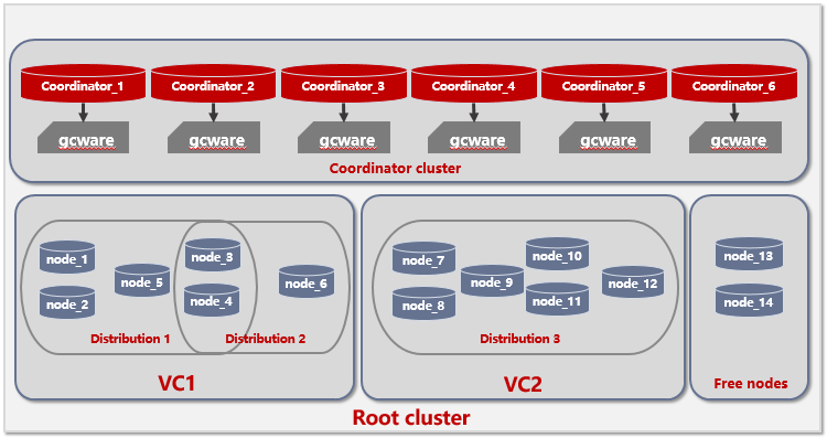 通常Gclusterd与GCWare组件部署在相同的物理节点上,统称Coordinator 集群:作为整个数据库的管理者与统一入口。