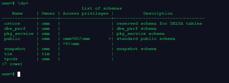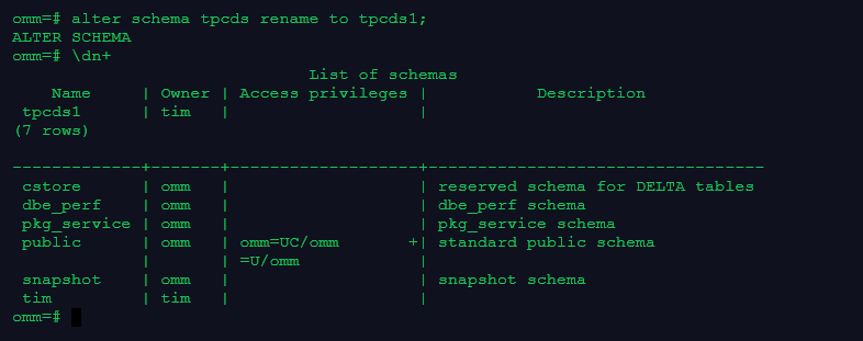 2.创建一个用户tim, 并将tpcds的owner修改为tim,且修改owner前后分别使用\dn+查看模式信息